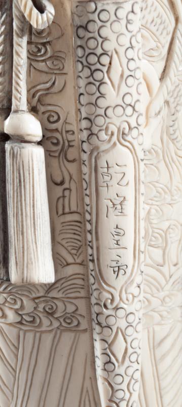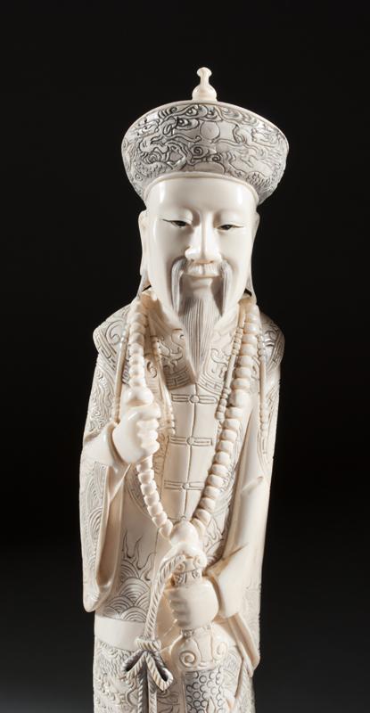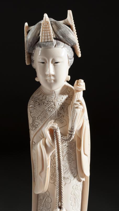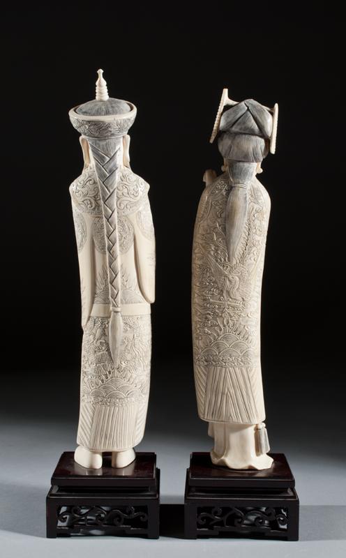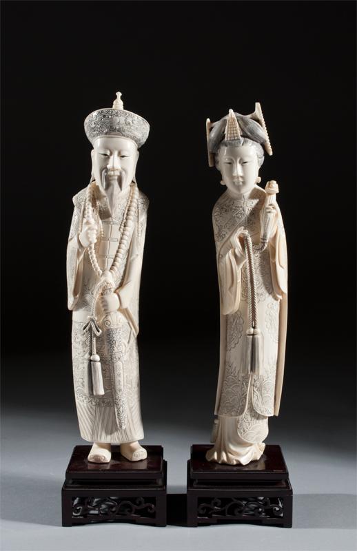 Finley carved to depict an emperor and empress, him with beaded neckpiece and sword, her holding a ruyi with tassels, both with inked highlights, both on carved wood openwork stands, 12.75" and 12.25"H, not including the stands, circa early 20th century.