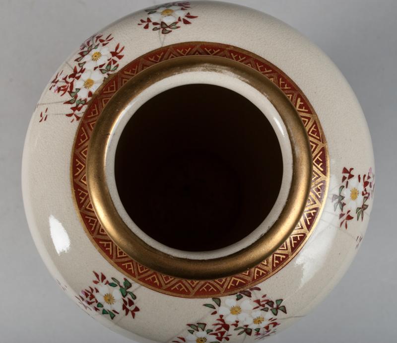Finley enameled to depict pagodas under pine trees and apple blossoms and a rocky shoreline, the neck and foot rim finely decorated with red and gilt to depict waves, the base with three character mark in gilt on a red flat trimmed in gilt, each 8.75"H, circa late 19th - early 20th century, just a fabulous pair.