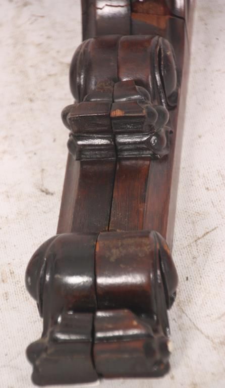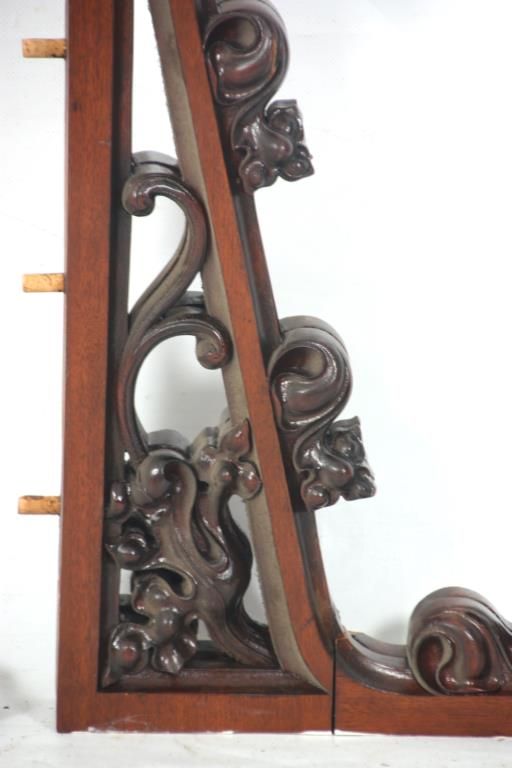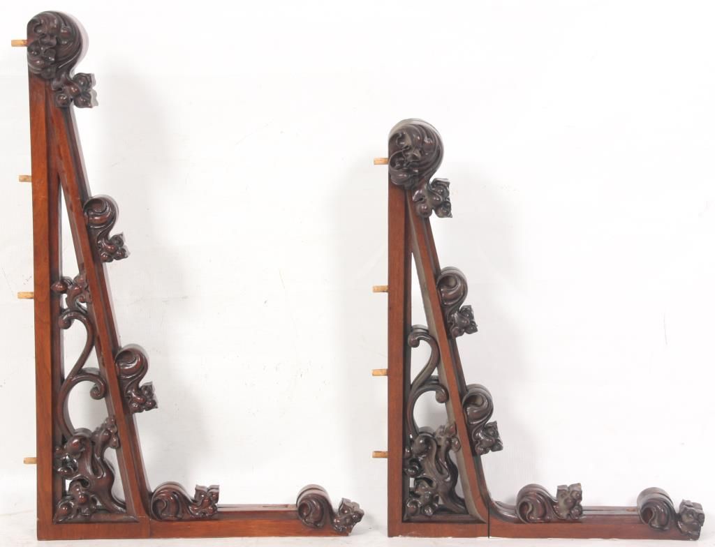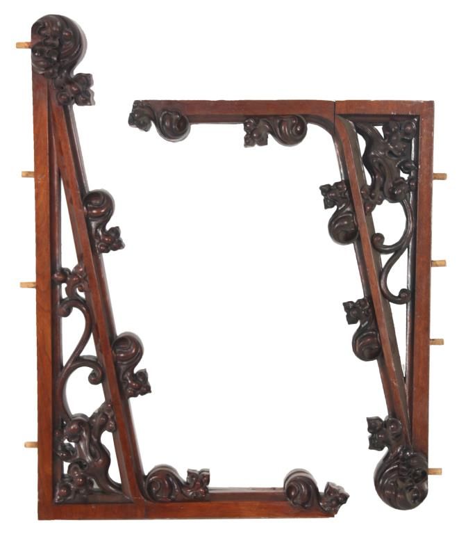 Pr. Gothic Carved Walnut Corbels. Pierced carved angled corner pieces with swirling leaf carvings, measure 17.5 in. wide x 2.5 in. thick, one is 22 in long & the other is 27 in. long.