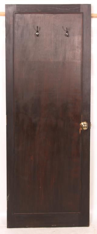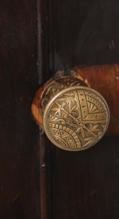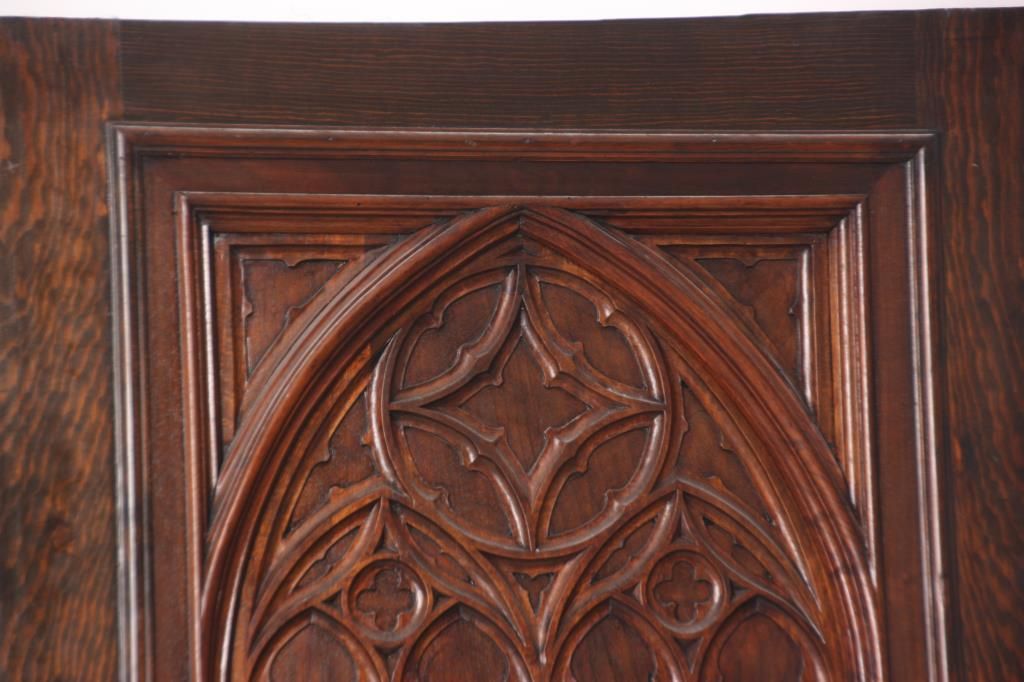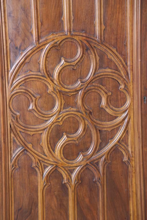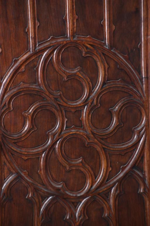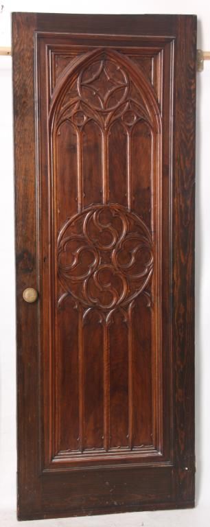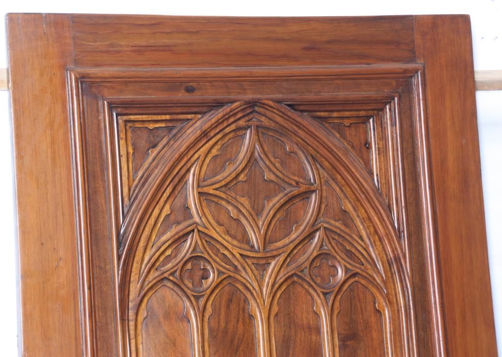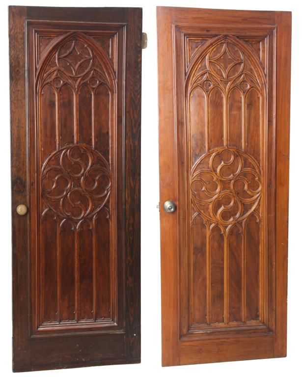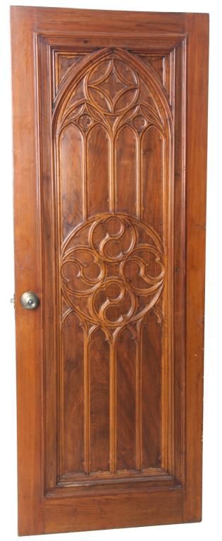 Pr. Gothic Walnut Closet Doors. Walnut door with carved gothic arched moldings in the inset center panel and a round medallion in the center with 4 stylized Yin-Yang symbols. Doors are in good overall condition, one door has an ash wood outer frame and a darker finish. 80 in. high x 30 in. wide.