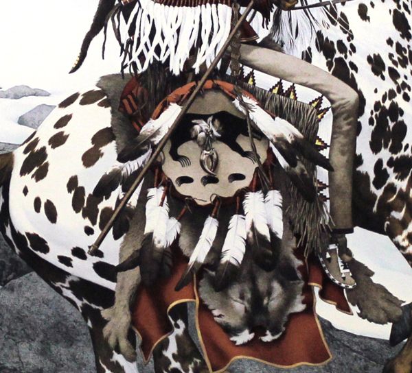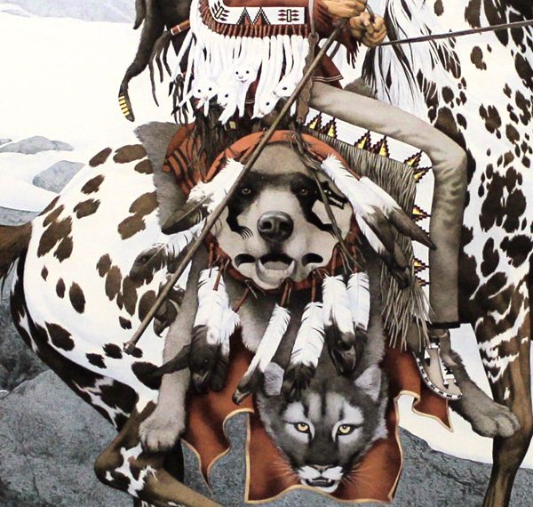 The Blackfeet warrior rides across the snow covered wilderness. On his solitary journey, he carries shield and spear, and is adorned in the pelts and feathers of the fiercest predators in his land. But he is not alone. Trough a dream quest, the warrior has earned the spiritual protection of animals admired for their ferocity and cunning. They warn him of danger, increase his battle prwess and give him magical strength.