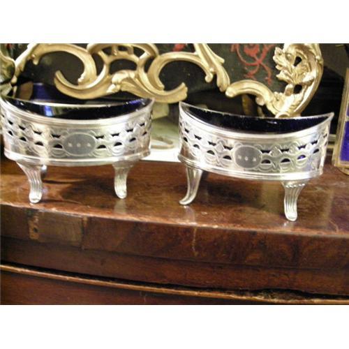 We offer a pair of magnificent pair of pierced Bateman sterling open salts made in London.The liners are contemporary with the silver and are in very good condition without breaks. Beautifully pierced they are lightly engraved . This engraving is contemporary and is not a Victorian embellishment.