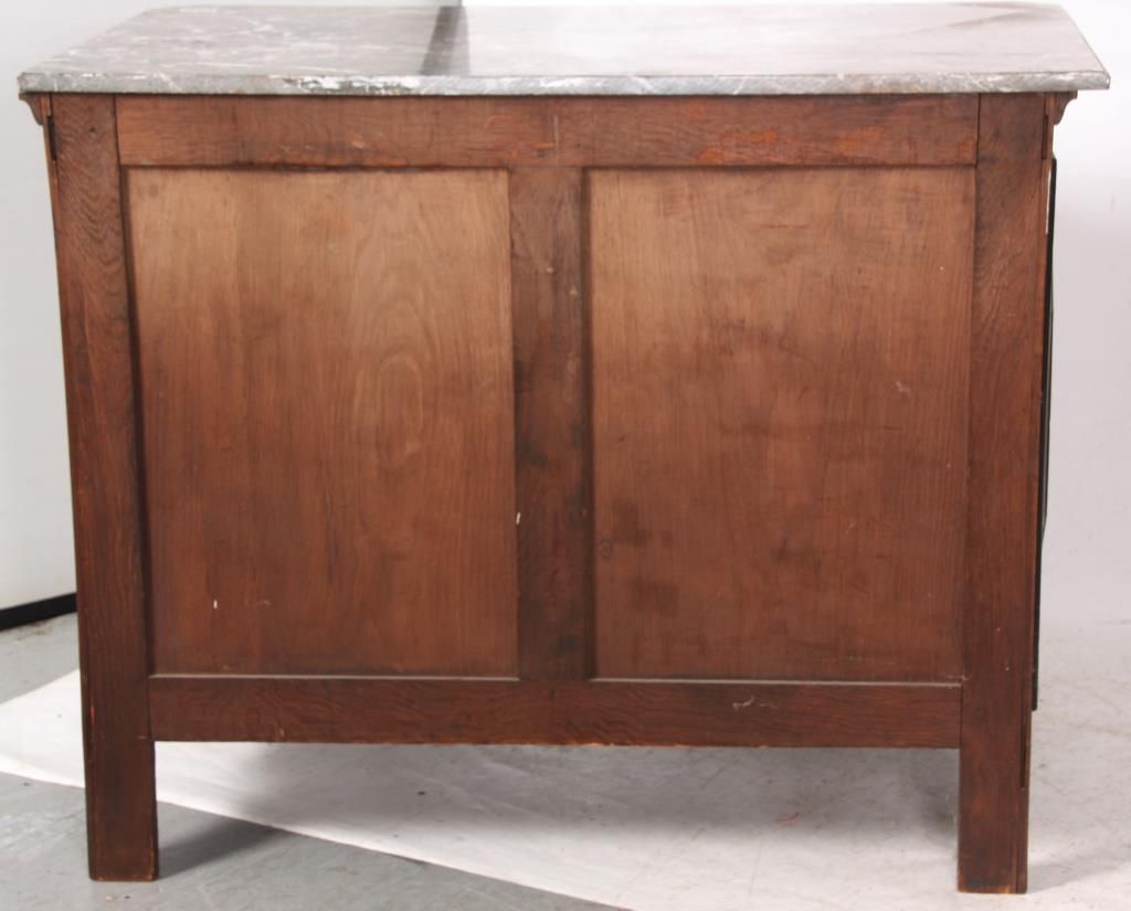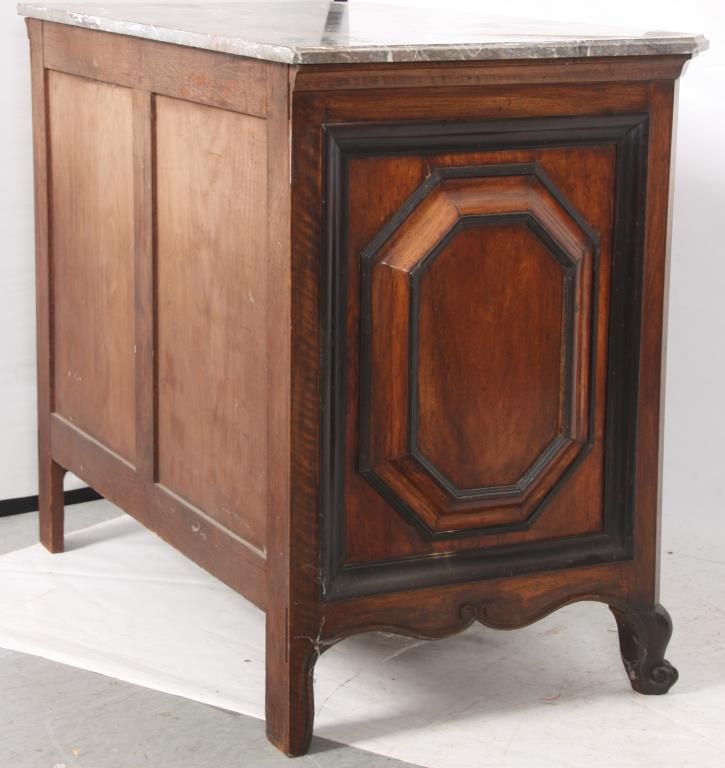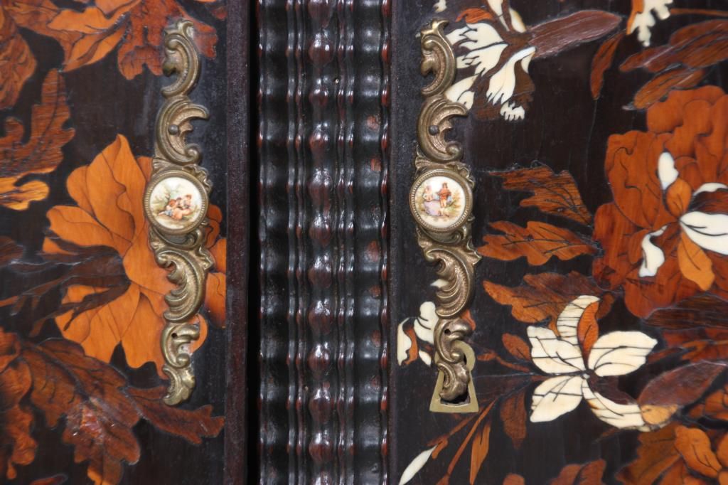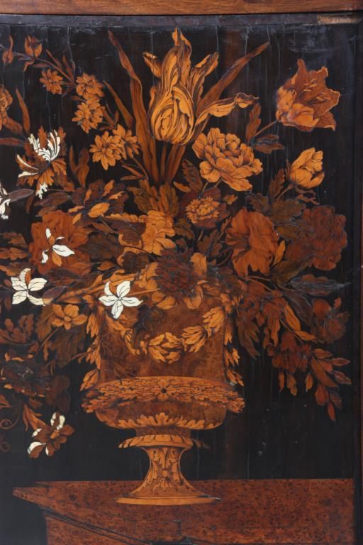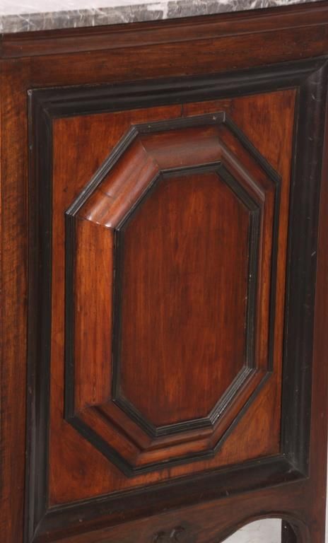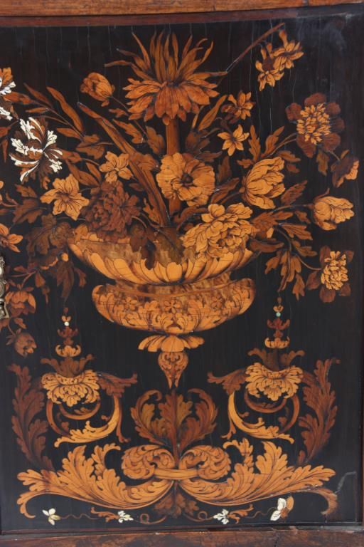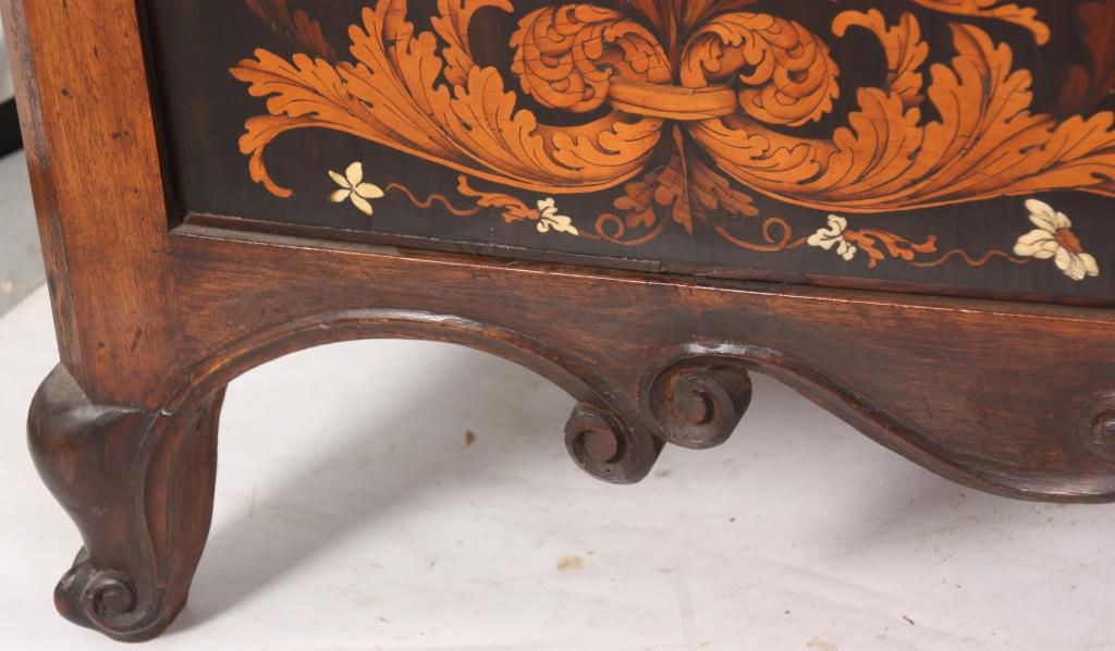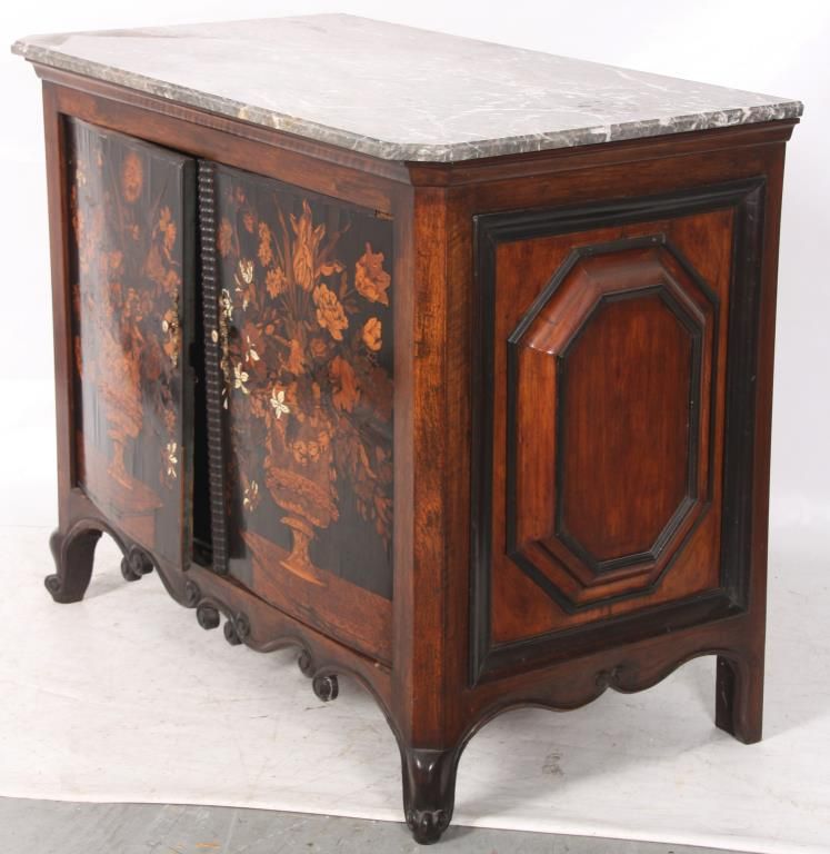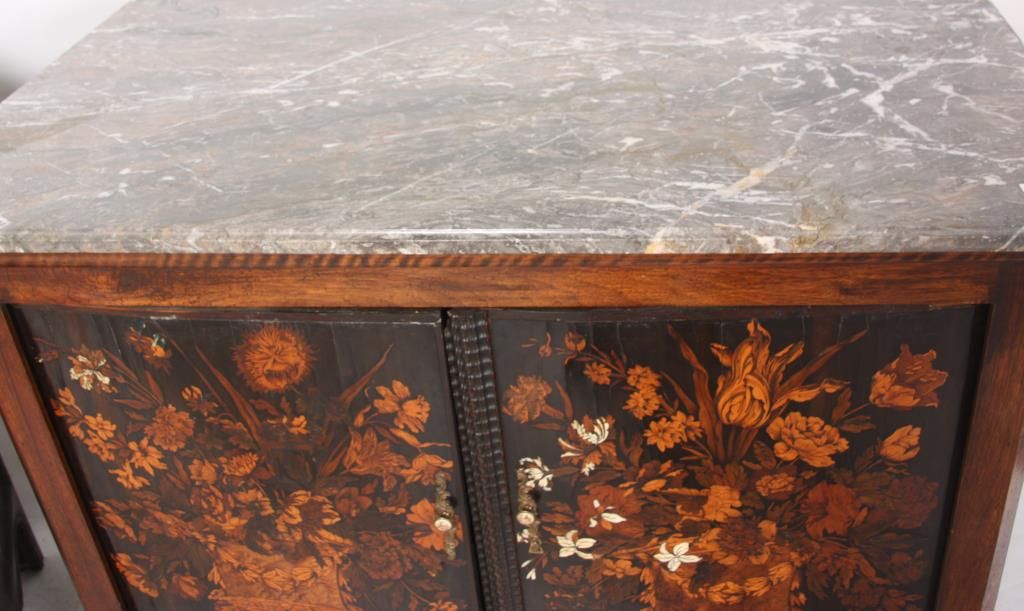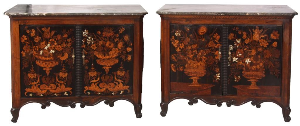 Pr. Inlaid Marble Top Cabinets. The grey marble tops have a beveled edge and chamfered front corners; on a carved walnut case with scrolling feet and large raised panels, the 2 doors have marquetry inlays with a center bowl overflowing with large beautiful flowers and leaves. Cabinets and inlays are in very good condition, no missing inlays, both marbles have good repairs. Period 17th century doors are matched to the mid-19th century made cabinets, marbles are replaced. 35.25 in. high x 45.5 in. wide x 24.25 in. deep.