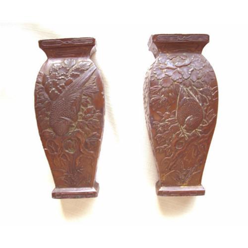 BURTON BROOK FARM ANTIQUES presents a pair of Meiji Period Japanese bronze vases decorated in high relief with native birds nestled among Japanese floral botanicals.~ 6" tall X 2 1/2" at middle wide point X 1 3/4" wide base. One vase bird side has a small metal round shape repair ( see image ) and one narrow vase side has a slight press mark.