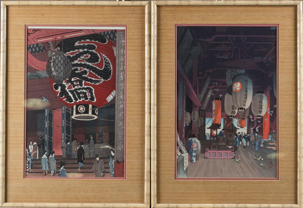 Depicting figures at what appears to be a play or festival both signed and sealed lower right very well done both nicely framed and matted in bamboo style frames not examined out of frames, 14"H X 9"W sight, 19"H X 13.75"W framed circa early 20th century.
