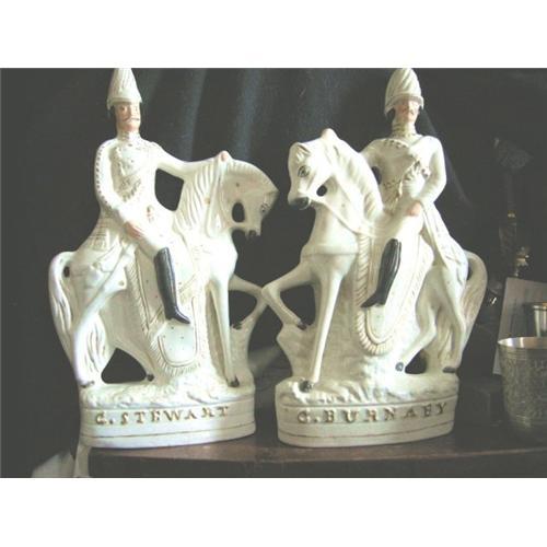 We are thrilled to be offer a magnificent pair of wonderful antique Staffordshire mounted figures. They represent two Victorian generals who are identified as C. Stewart and C. Burnaby. These identifiers are highlighted in gold. Gold is also used to highlight the buttons on the figures and to some extent the sadle accoutrements. The rest of the colouration, apart from the faces, hair, and moustaches, are essentially a whitish cream. The faces are pink, and the hair and moustaches are black.