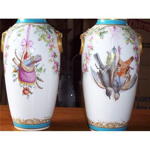 These are absolutley exquisite vases. I have photos of the back as well. They are stamped with a crown and Minton, which is Stoke, Staffordshire, England, period 1862-1871. They are in perfect condition. Price is for the pair