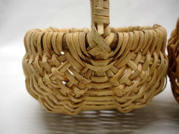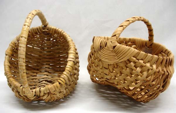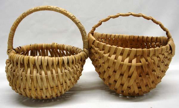 Pair of East Coast Native American Buttock Baskets. Largest is 4''x7'' not including the handle. Hallmarked by artists. It has initials on the bottom, ''RC.'' The smaller basket has initials on the bottom, ''LP.'' Buyers Pay Actual Shipping and Handling Charges(see terms and conditions for more information).