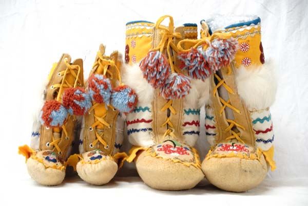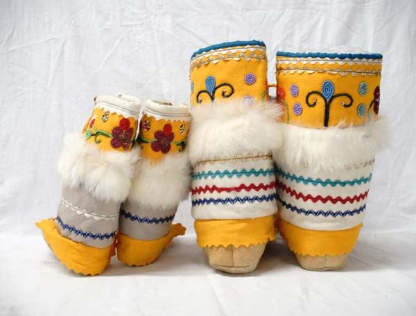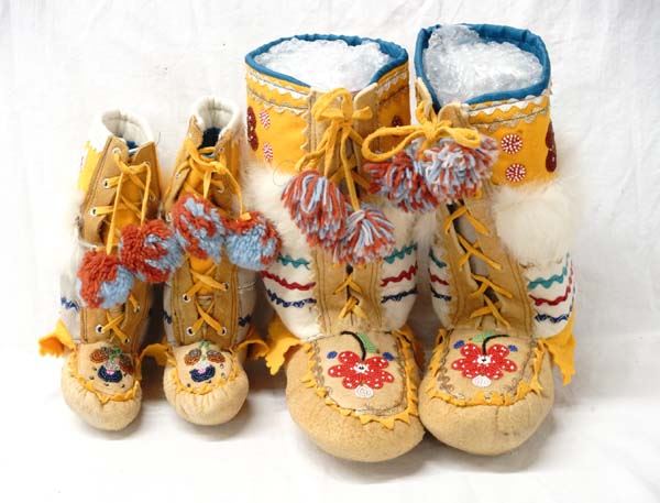 Pr Native American Iroquois Hand Beaded Moccasins, beaded high top, felt and leather with fur embellishments, largest measures 9.25''T x 9.5'' heel to toe, leather ties with pom poms, stunning colors and workmanship, exquisite beadwork