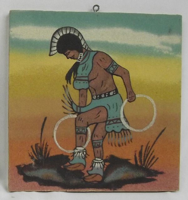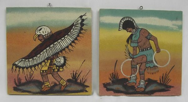 Pr Navajo Sand Paintings. 8'' x 8''. Sand Paintings were an integral part of healing the sick in ceremonies used by tribal healers. Small metal loops for hanging on the tops.
