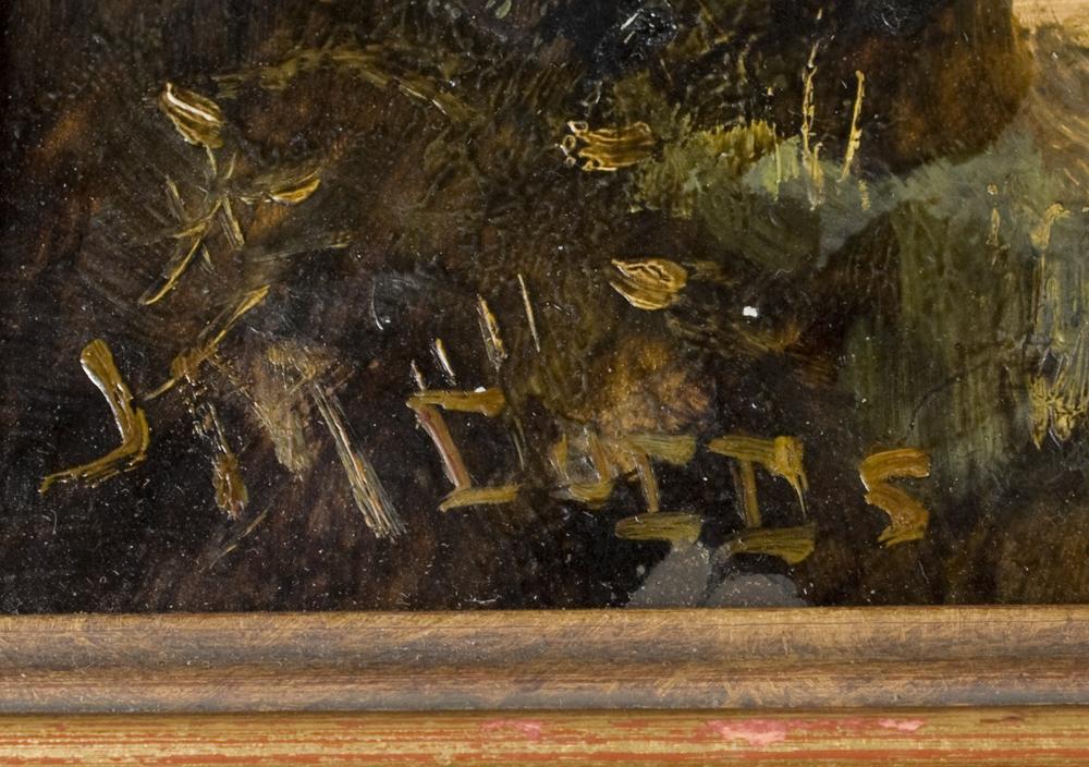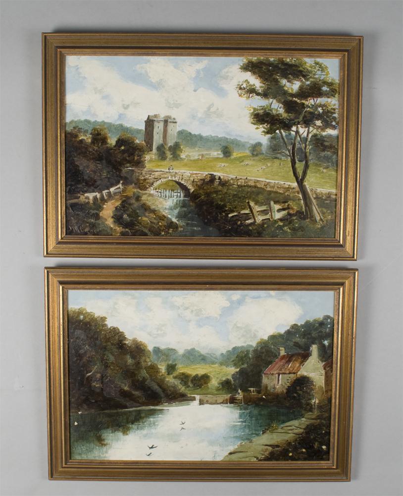 First titled, "The Old Snuff Mill at Bramond," depicting a millhouse with trees and birds flying about. Second titled "Bothwick Castle & Brace Bridge," depicting castle, field and bridge with figures about. Both measure 11.75" H x 18" W (sight), signed illegibly in LL. Titled en verso with original Hudson's tag and stamped June 7, 1965.