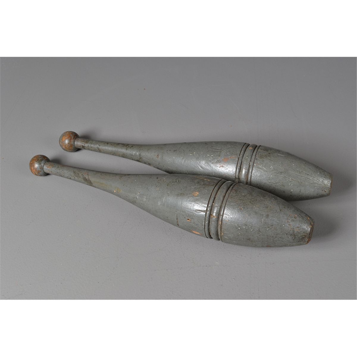 With incised carvings and ball tops, in original gray paint. 18" H. Circa 19th century. Private collection Gregory, MI.