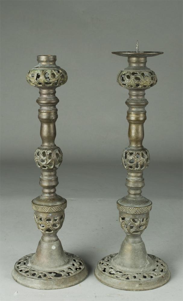 19th Century, center column with three areas of cut-outs in swag designs, as well as the bottom. 16.5" H, one lacking top plate, both heavy discoloration.