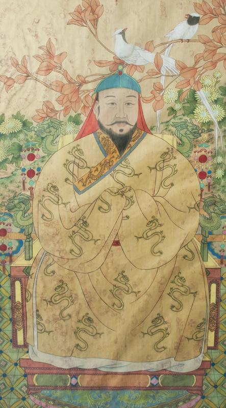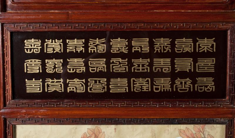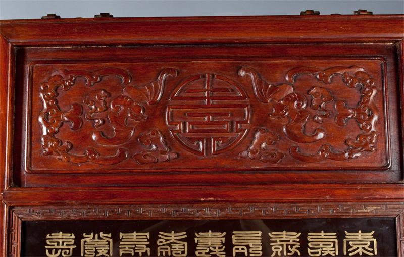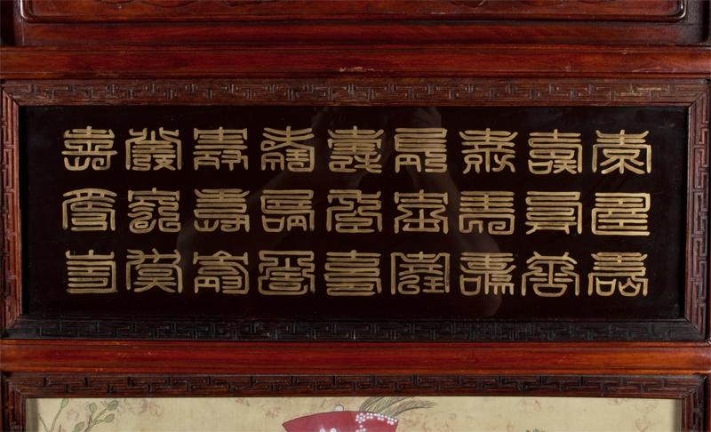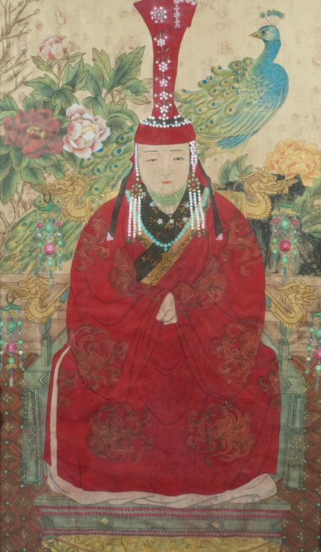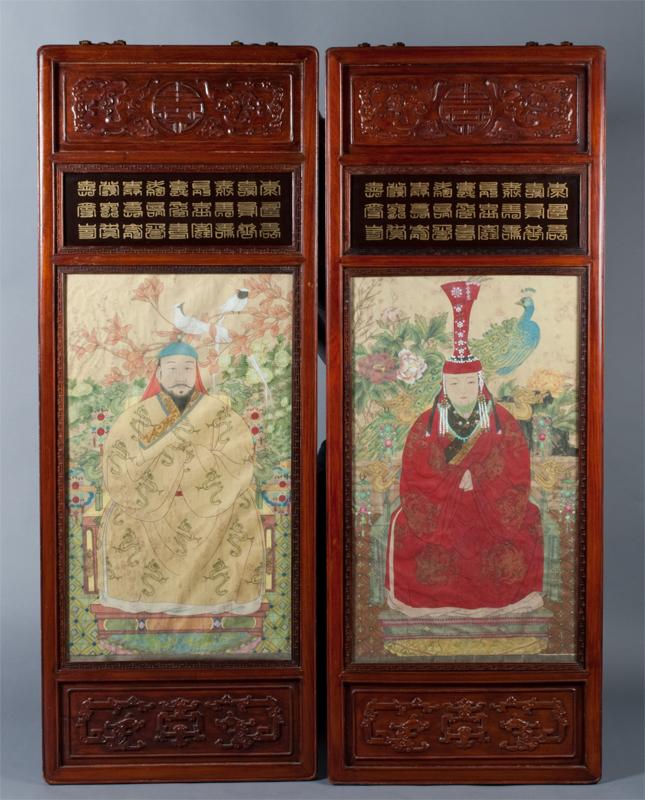 The gentleman in a yellow dragon robe amongst foliage with two white doves, the lady fully robed in red with elaborate head piece amongst foliage and a peacock, both seated on thrones both mounted in elaborate carved wood frames, each finely carved to depict bats and Shou symbols each frame with three lines of calligraphy in gilt behind glass, both with brass hangers, 62"H X 23.75"W, circa 19th century, the paintings possibly earlier. Private collection West Bloomfield, MI.