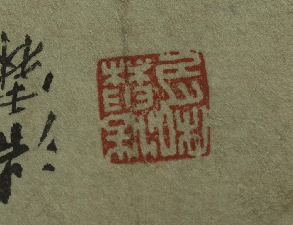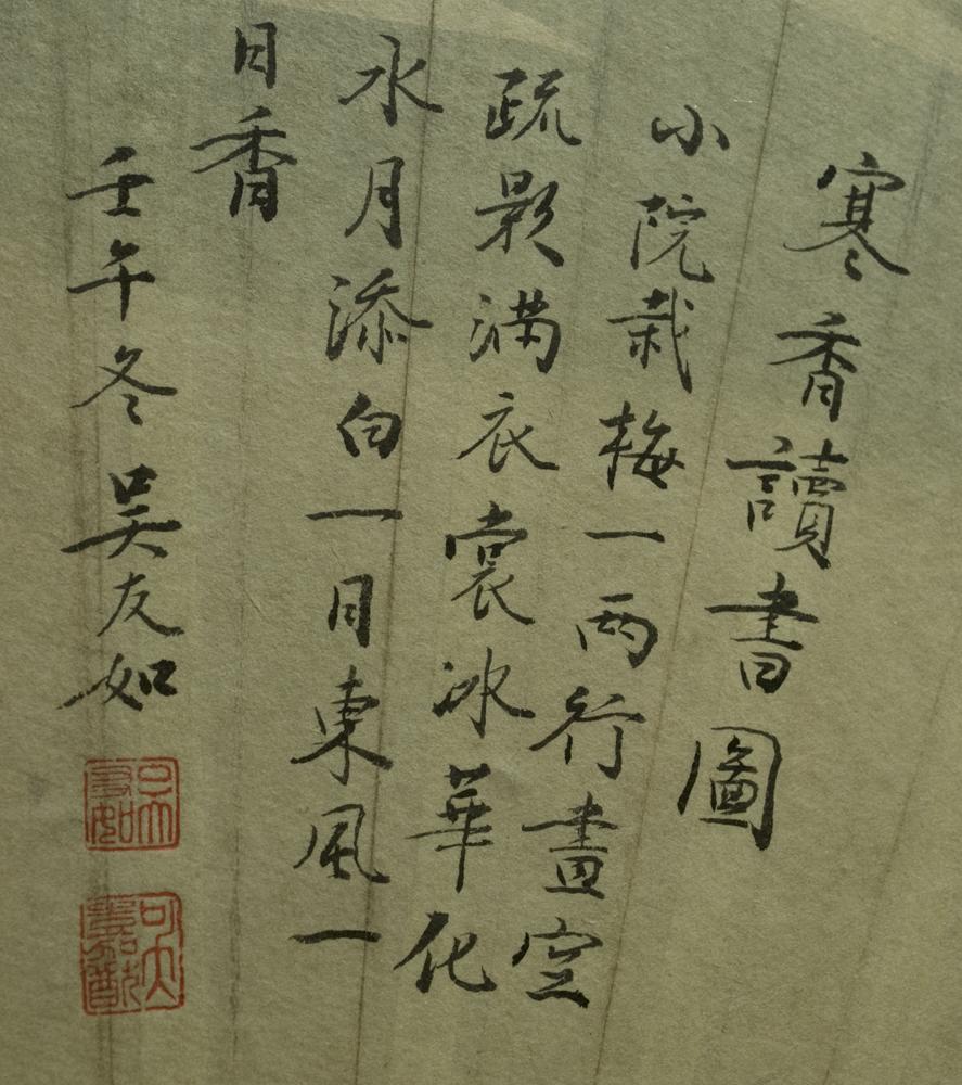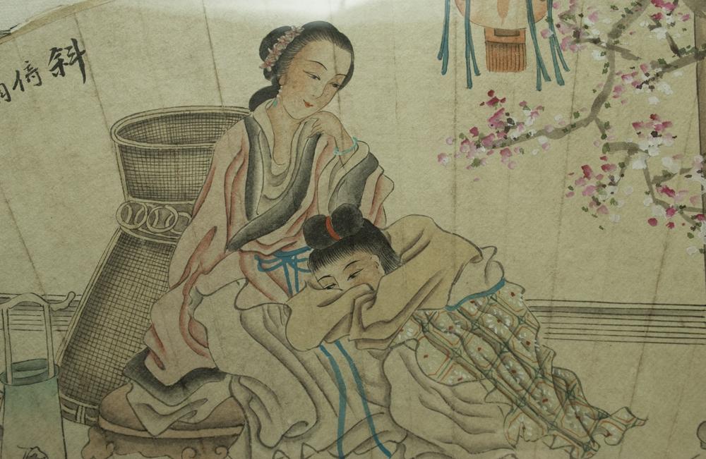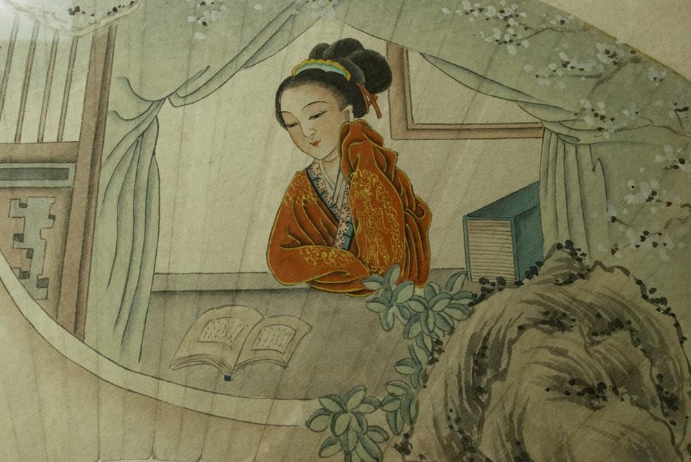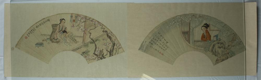 Both paper fans attached to paper, first fan painted to depict a view of an interior scene of a girl sitting at a table reading a book, with flower blossoms around window, seal mark and signature in L. Second depicting two female figures on a porch, resting against a basket with one crying and the other holding her, seal mark and signature in UL. Both papers measure 14.5" H x 25.5" W, unframed.