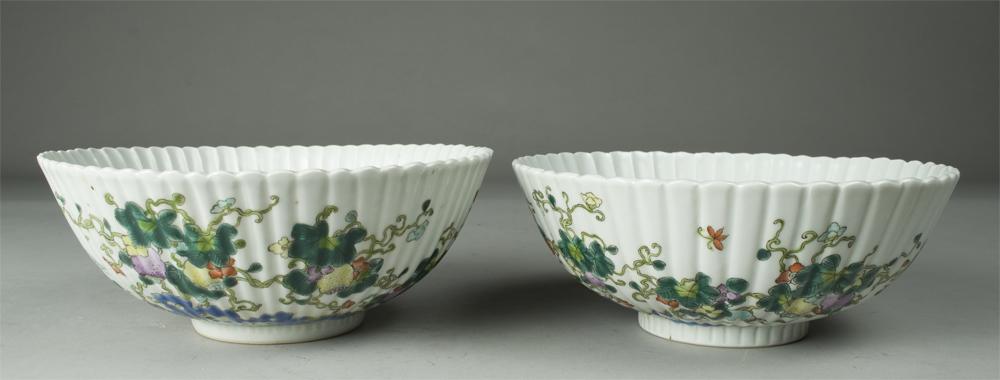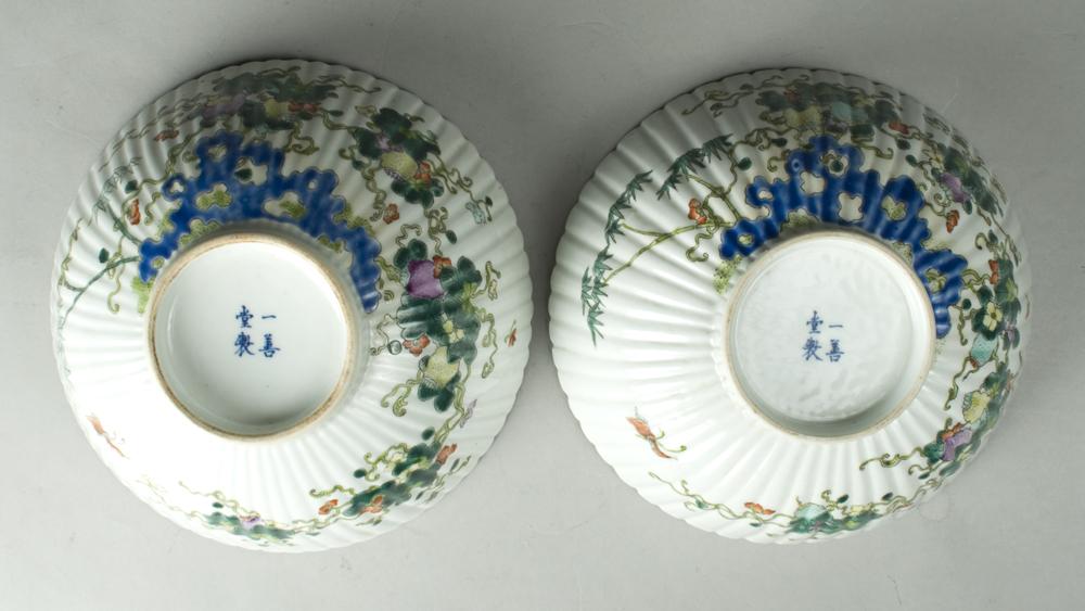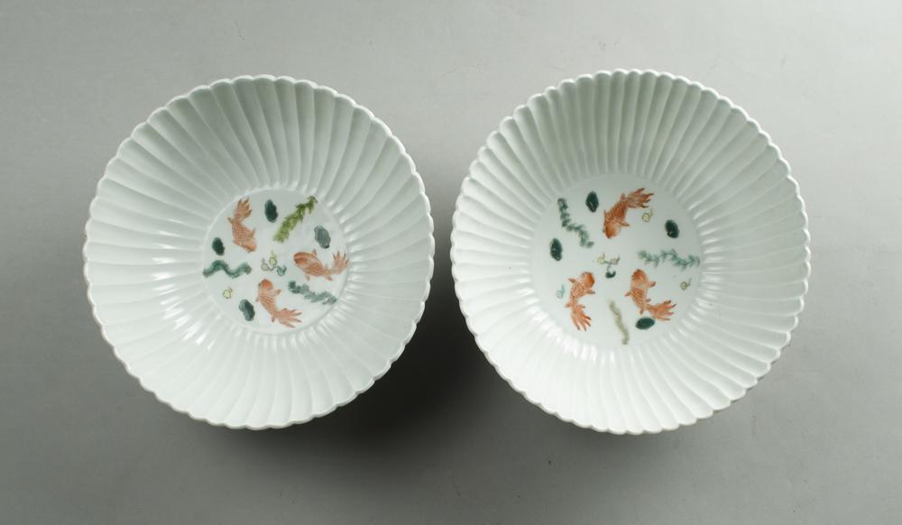 Both in scalloped edge and shell design, exterior decorated with bamboo trees and various colored flowers. Interior decorated with three Koi amid seaweed. 3.25" H x 8.25" Dia. Four character signature in underglaze blue on bottom. Circa 19th/20th Century.
