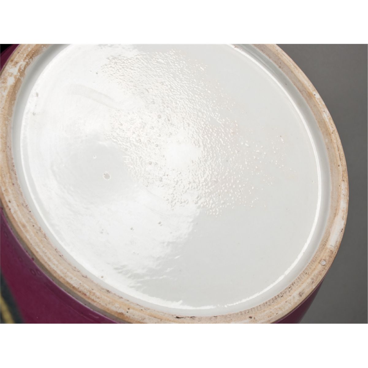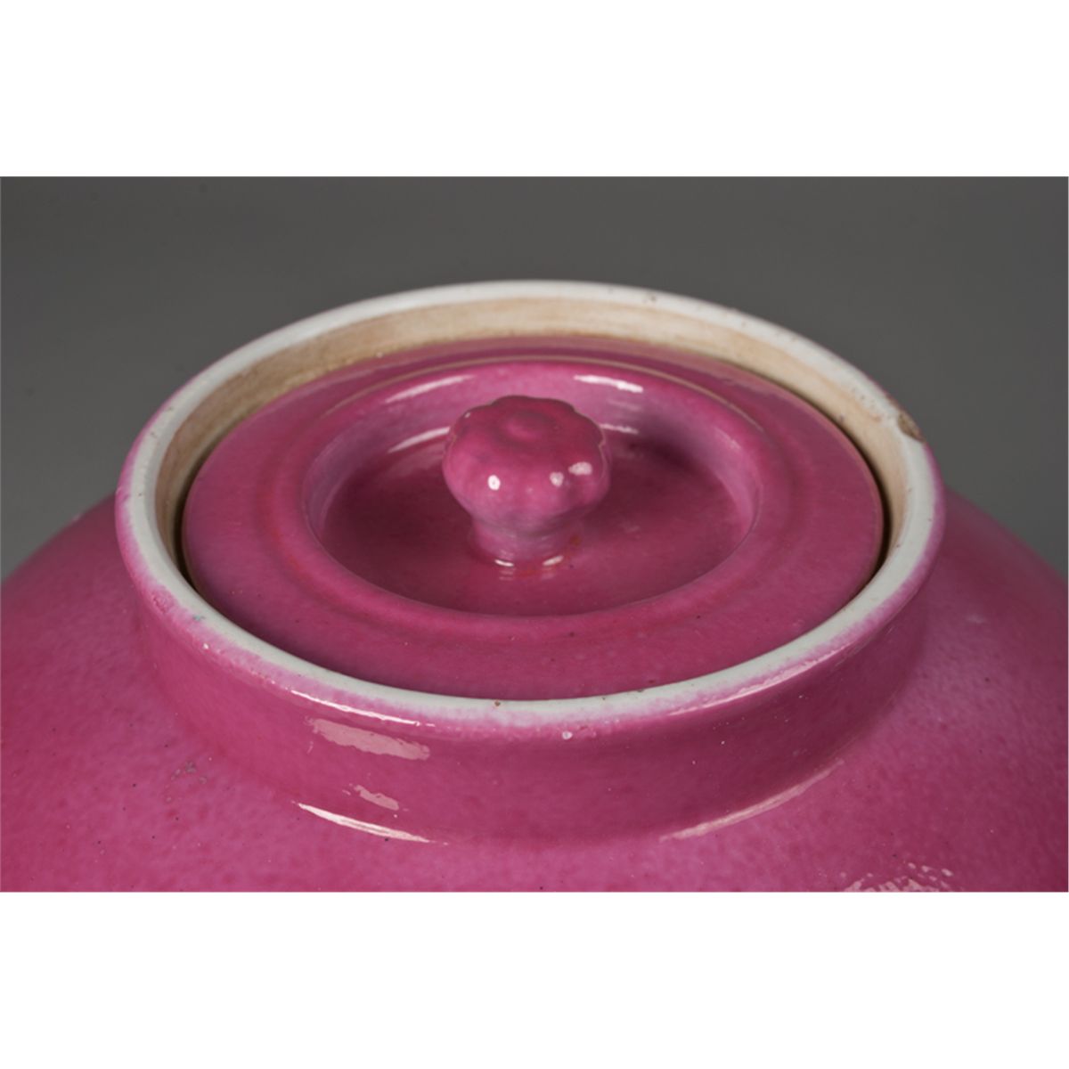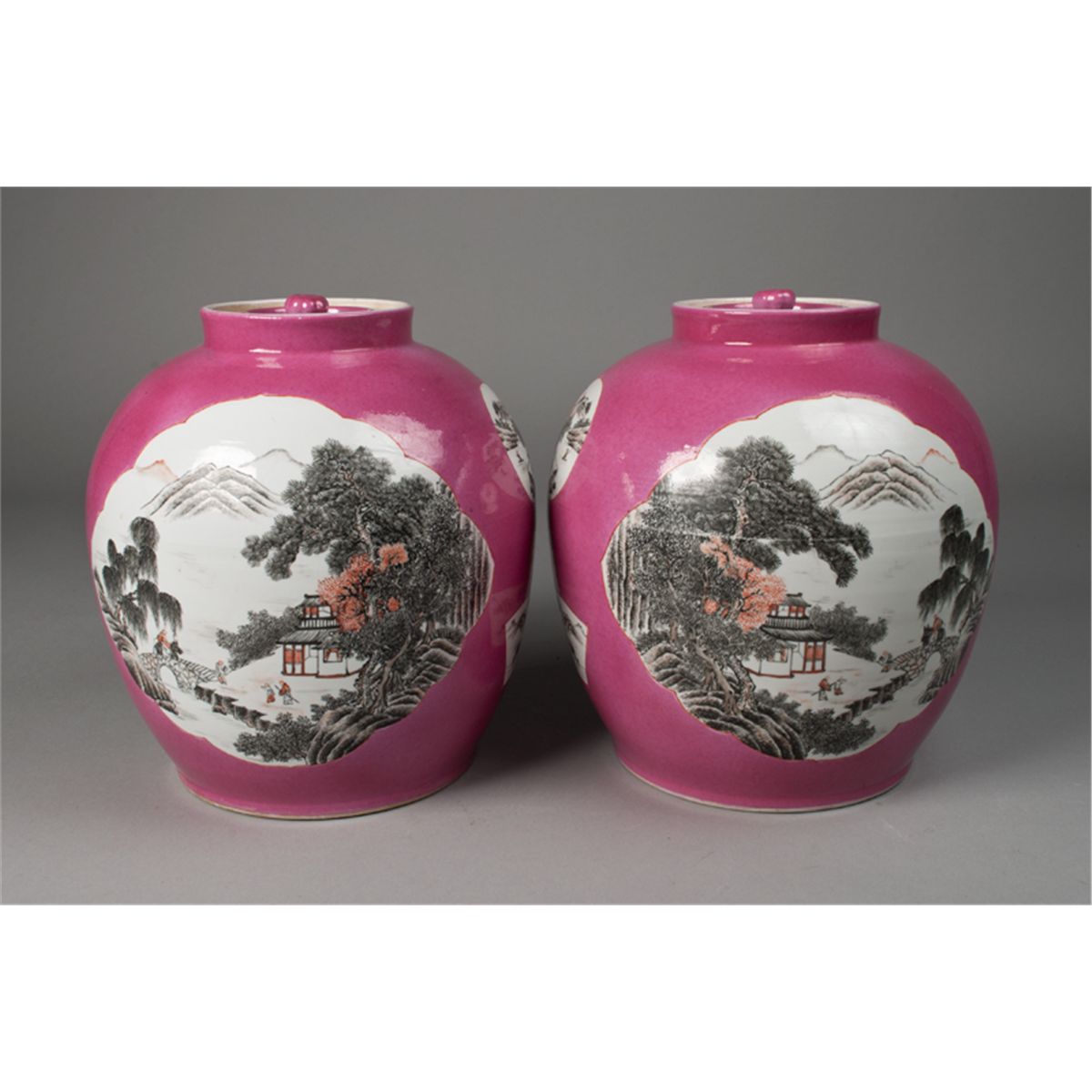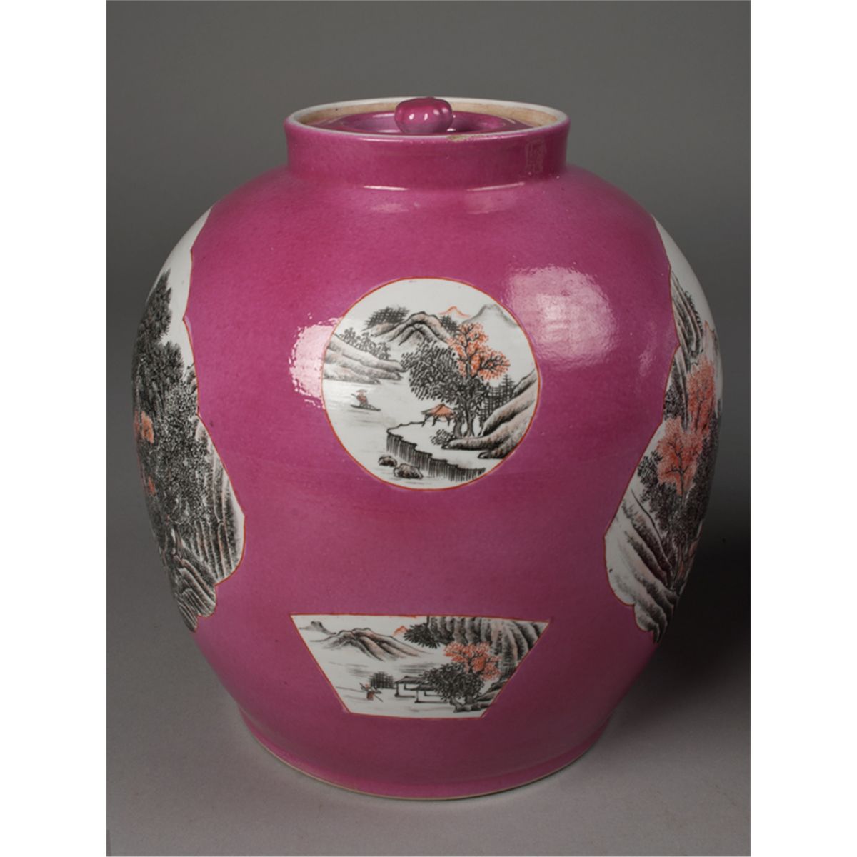 In a pink ground, each with cartouche shaped figural and landscape scenes in iron red and black, separated by geometric shaped figural and landscape scenes. 11" H x 10.75" W, 20th century. Private collection Las Vegas, NV.