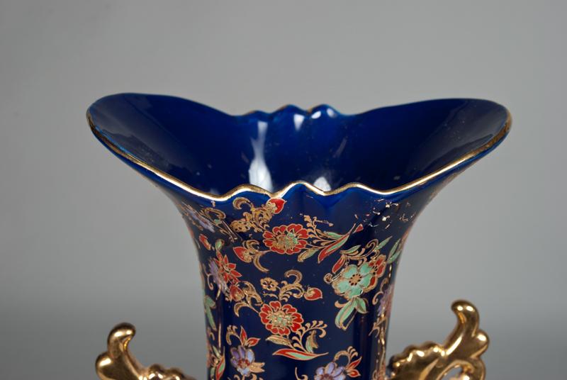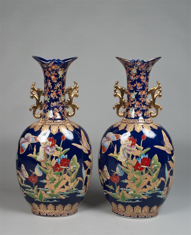 In cobalt ground with floral and butterfly designs, heavily highlighted in gilt. Decorative scrolled gilt handles, 23" H x 11.5" W, from the Jaymee Collection Paris. 20th century.