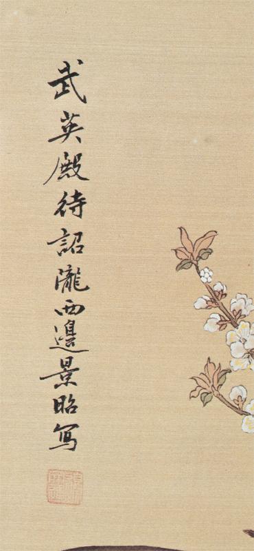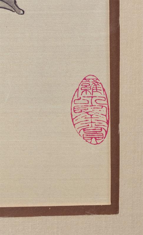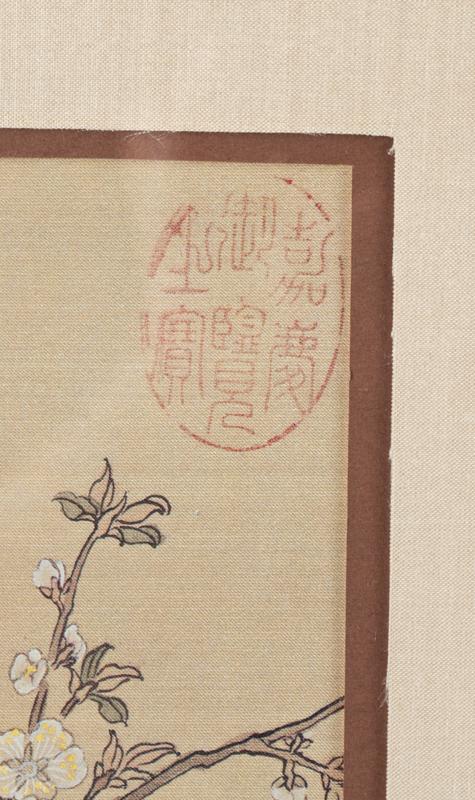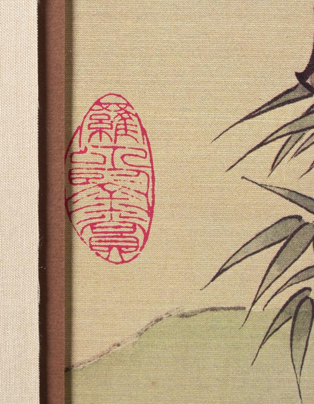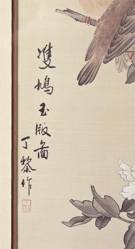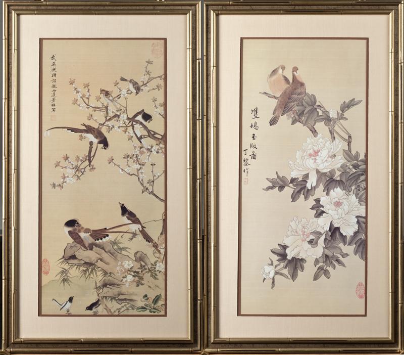 Both finely painted, one to depict lovebirds in cherry blossom trees, the other painted to depict a pair of doves in a peony bush. Both signed and sealed, each measure 24" H x 10" W (sight), 30" H x 17" W (framed), both framed and matted in giltwood frames to depict bamboo. Circa early 20th century.