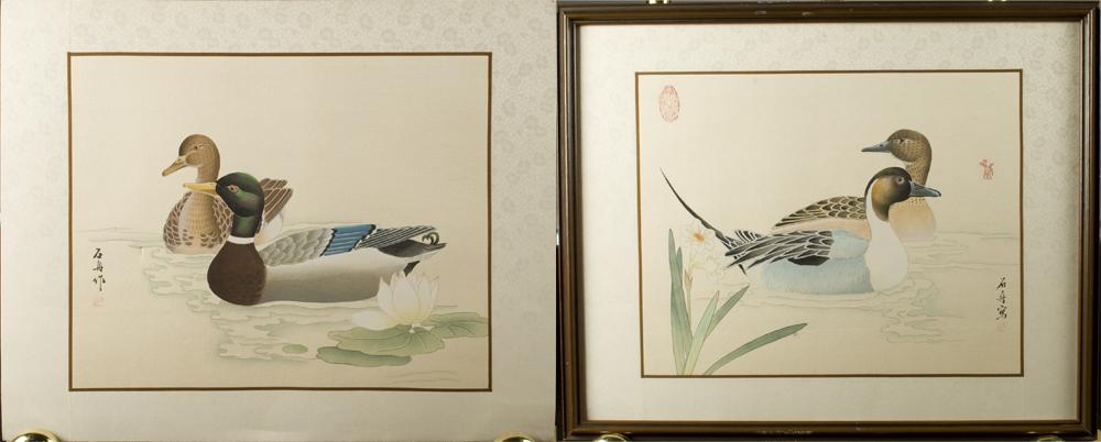 One framed, depicting a male and female duck, 12" H x 15" W (sight), signed in LR, seal mark in UL. Second unframed depicting a male and female mallard duck, 12" H x 15" W (sight), signed in LL. 20th Century.