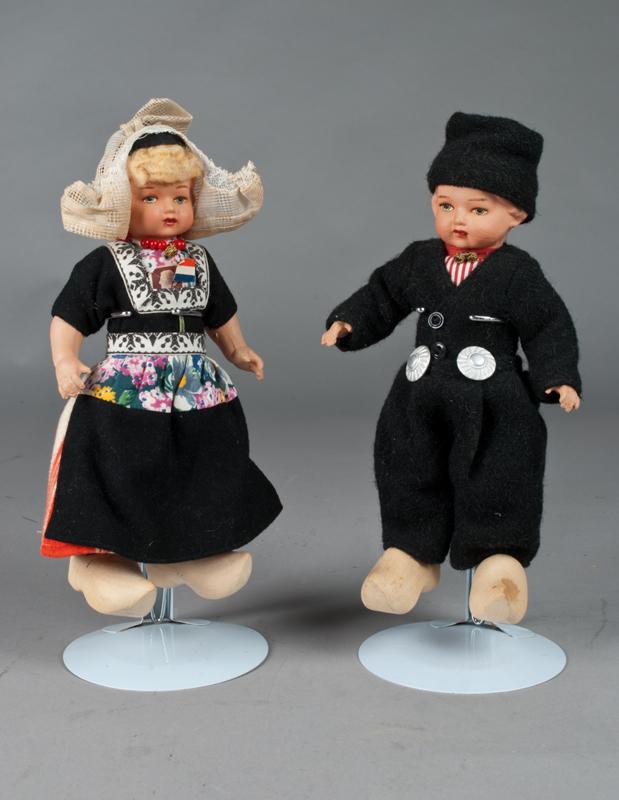 Boy and girl doll with Dutch wood shoes, composition body and black wool clothing. 10" H.