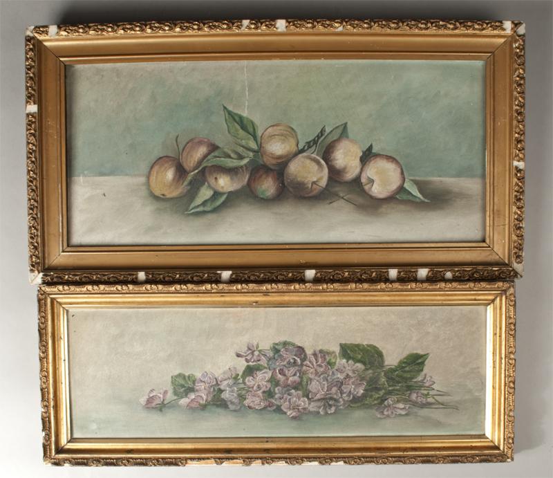 One painted to depict a violet, and other painted to depict a group of apples, and both framed in late 19th/early 20th century wood with gesso frames. Largest 8" H x 17.75" W with 1.5" for frame. Apple painting with large scratch 4" in UM, both frames with gesso losses.
