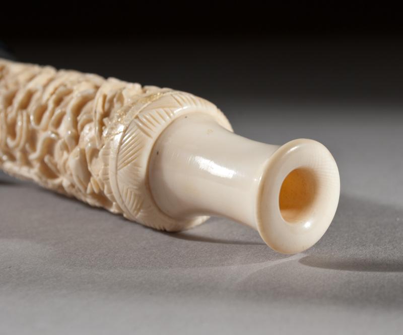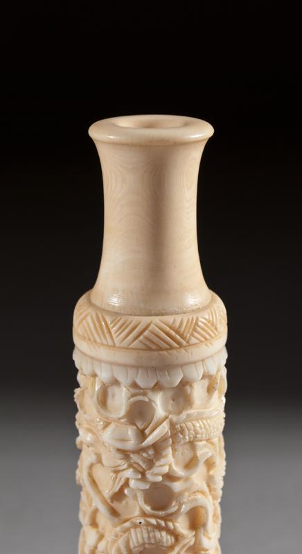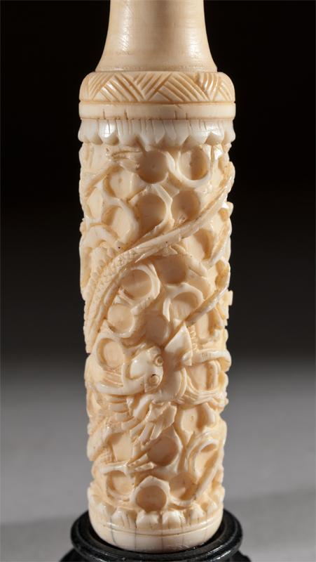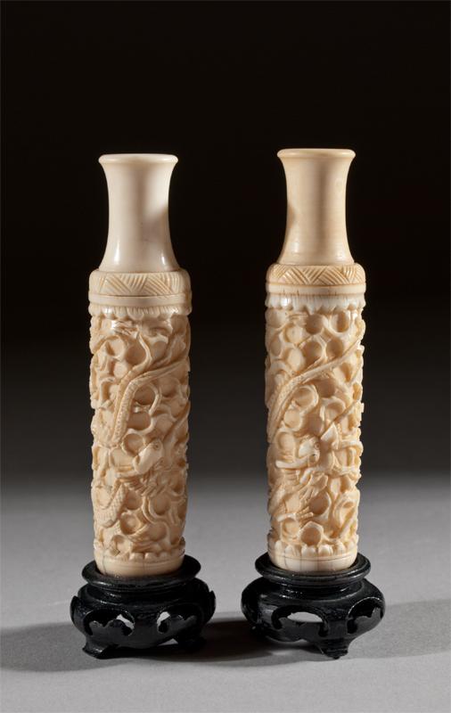 Both with detailed carvings of dragons amid ruyi clouds, and with custom fitted wood stands. 3 & 15/16" H x 1" W (ivory only). Early 20th Century.