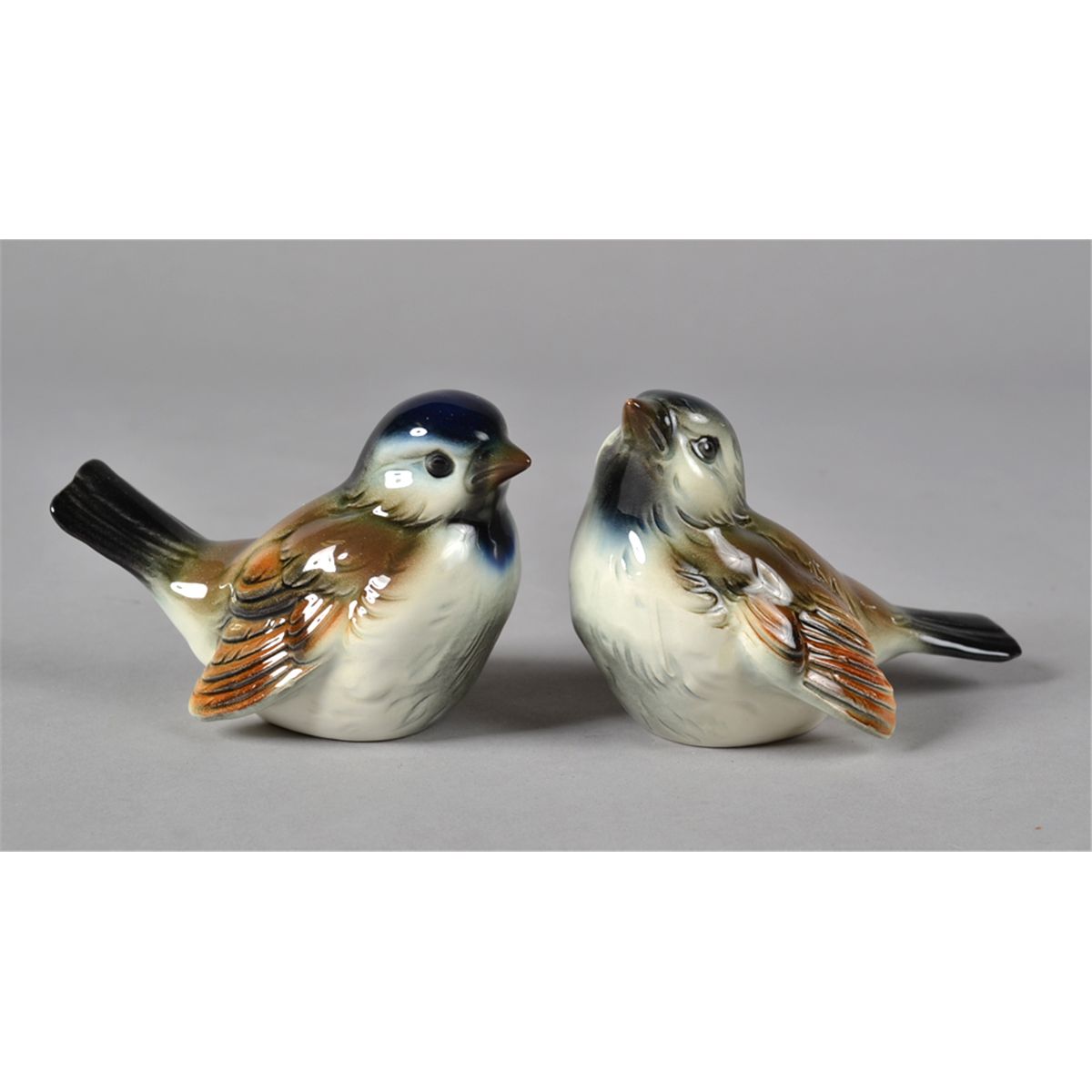 One with head slightly turned, the other looking straight on. Both in black, brown, white and blue and marked Goebel on underside. Approximately 4" L, both in excellent condition. Private collection Oxford, MI.