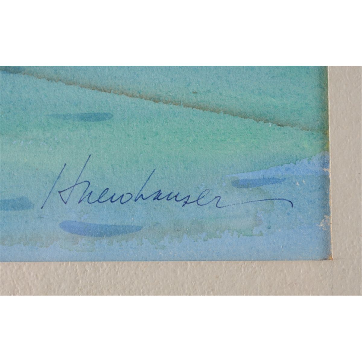 One finely painted to depict a mountain scene with figures riding horses. The other finely painted to depict a mountain stream scen with figures on a large rock. Both signed in LR, matted, framed behind glass and in wood frames. 24.5" H x 28.25" W, including the frame. Circa 20th century. Private collection Oxford, MI.