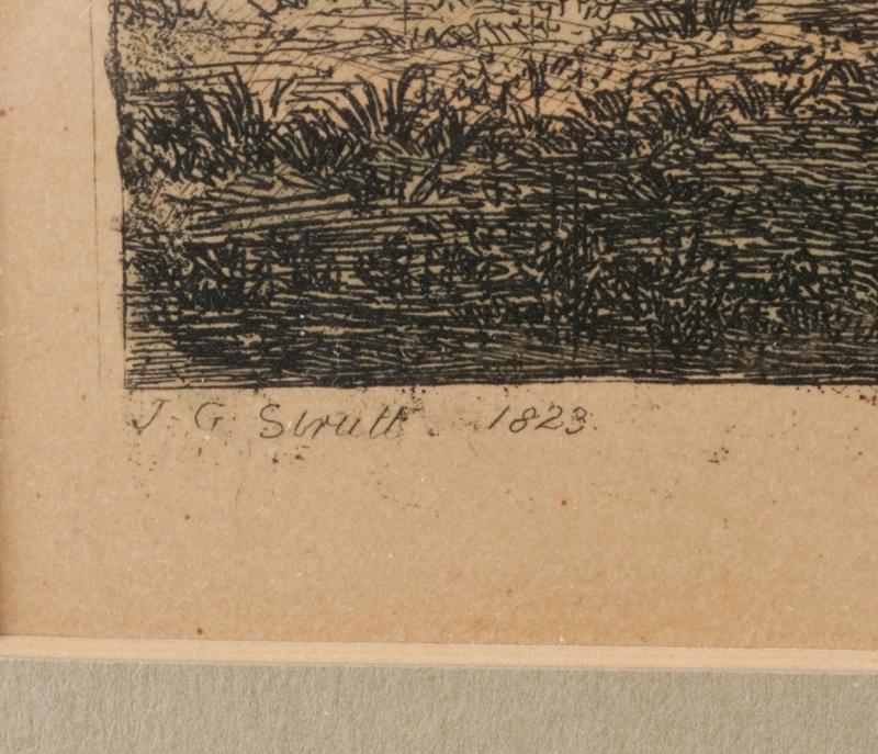 Jacob George Strutt, 1784-1867, United Kingdom. Includes etching titled "The Great Oak at Moccas Court," depicting large oak tree with figure lying underneath watching sheep graze, printed signature and dated 1823 in LL. Together with etching titled "The King Oak in Savernake Forest" depicting large oak amid trees with two figures below, printed signature in and date of 1834, with the 34 backwards in LL. Both in identical frames, and measure 11.25" H x 14.25" W (sight) with 4.25" of matting and frame. Both with toning consistent with age.