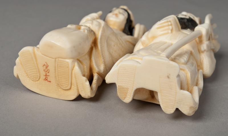 Finely carved male with holding a staff and censor, female holding a wine cup and basket, and both with ink decorated highlights. Both measure 4.25" H, late 19th/early 20th century.