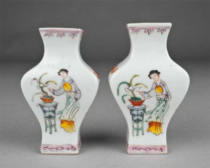 Miniature in stature, decorated on both sides with female near a plant holding a fan. Other two sides decorated with hanging chandelier with coins. 4 & 1/8" H, partial tag on underside.