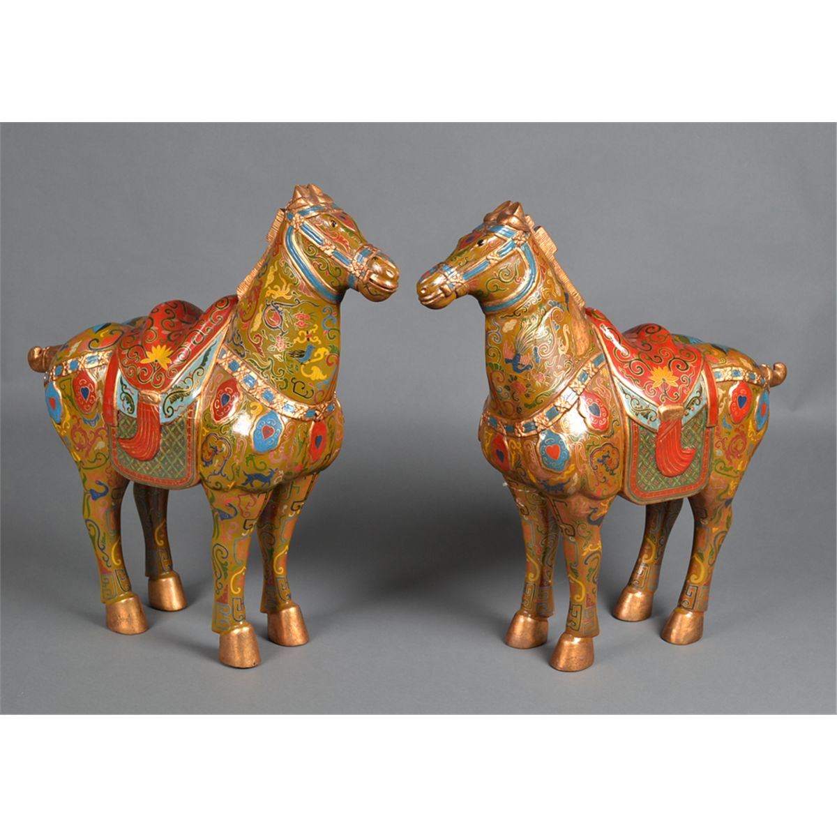 Finely carved to depict Chinese standing Tang horses, polychromed painted in multiple colors. 21" H x 21" L x 7.5" W. One horse with restored front right leg. Circa mid 20th century. Private collection Mt. Christies Estates, Oxford, MI.