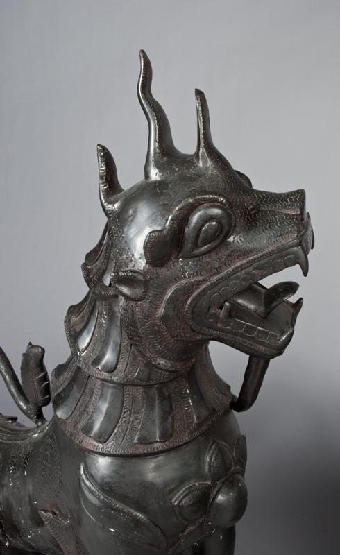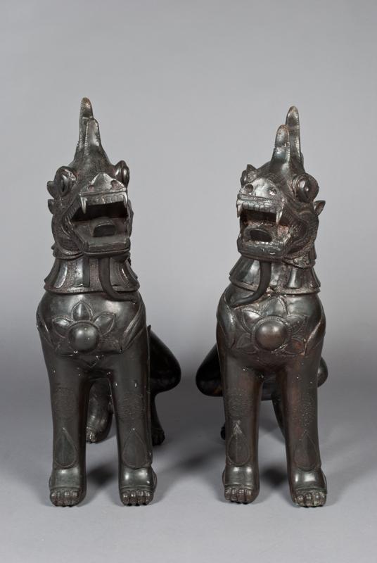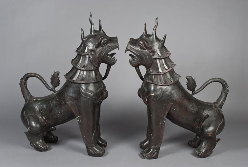 Both finely cast in a seated position with curled tails. 35" H x 28" L. Circa early 20th century.