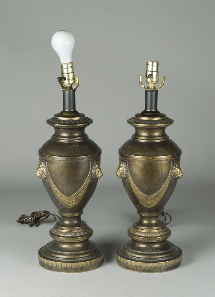Metal table lamps with lion heads connected by swag. 16" H (bases).