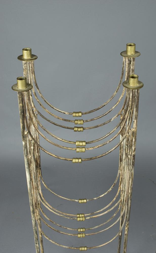Large candle holders with swag form iron wiring, holds four candles in two sections, resting on base with four ball feet and with distressed painting.. 44.25" H x 18" W x 7" D. One with separations at base and side.