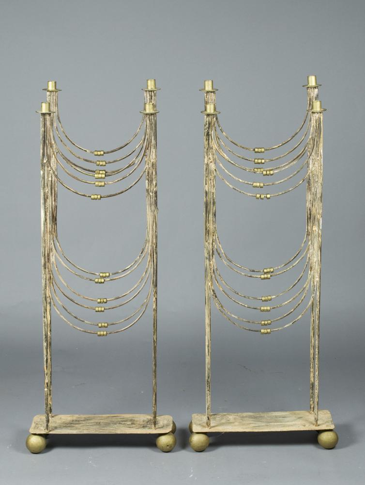 Large candle holders with swag form iron wiring, holds four candles in two sections, resting on base with four ball feet and with distressed painting.. 44.25" H x 18" W x 7" D. One with separations at base and side.
