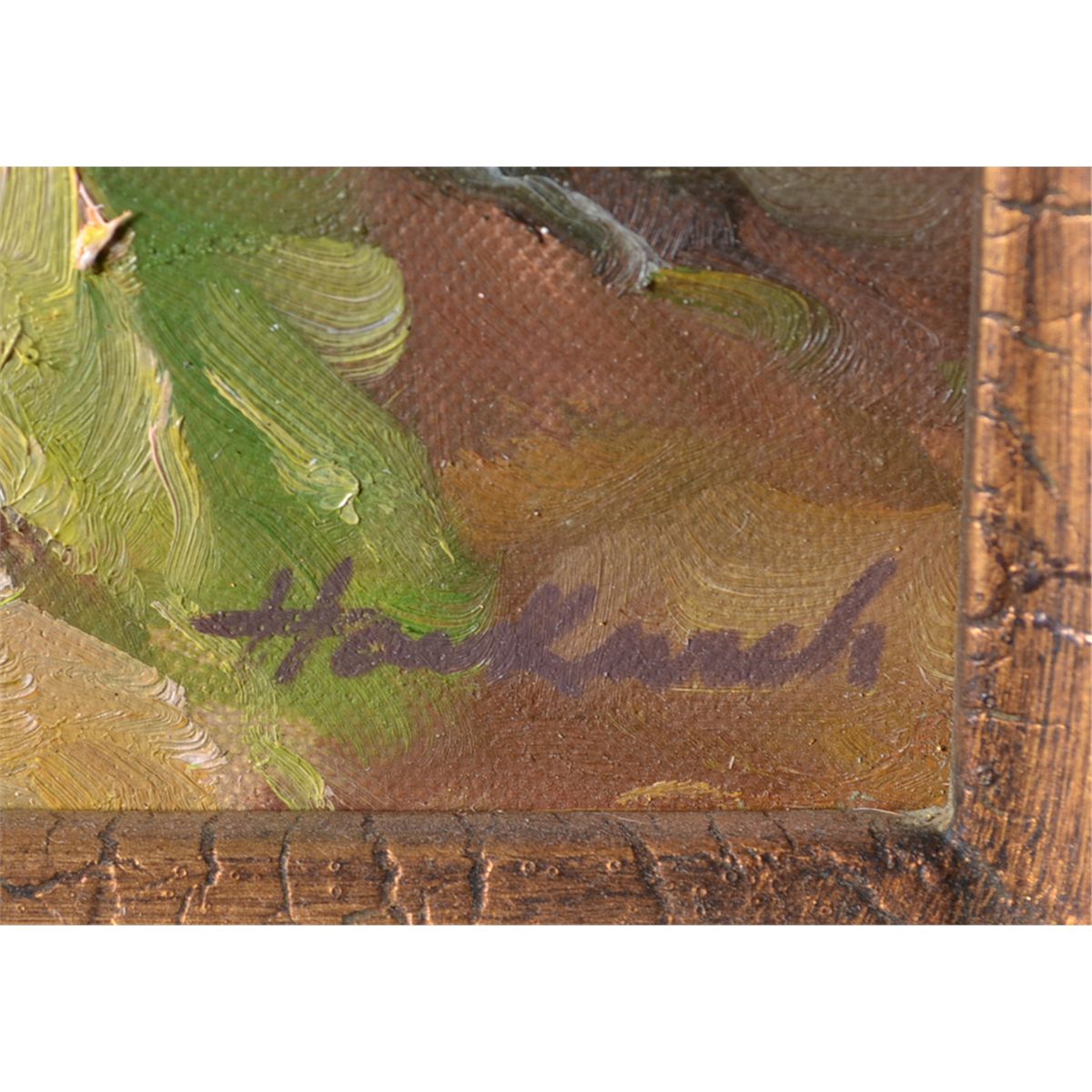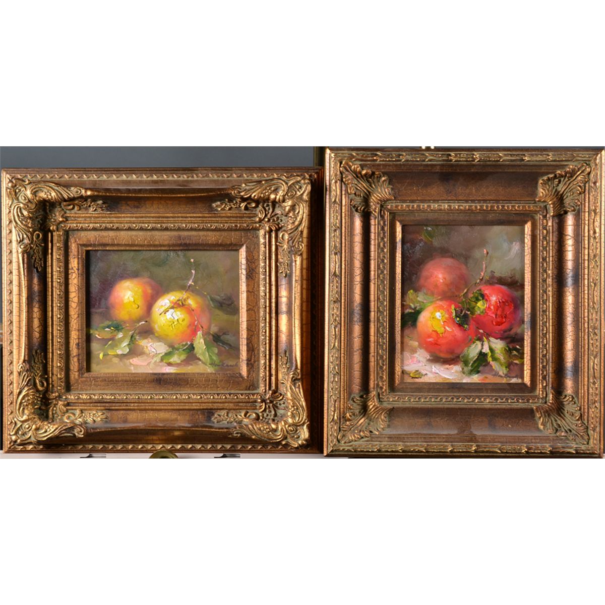 Each depicting a fruit still life with heavy impasto, and signed illegibly in LR. Both framed in carved wood frames painted gold with alligator finish. Both measure 9.25" x 7.25", sight, one measures 17" H x 19" W, framed and the other measures 18" H x 16" W, framed. Circa 20th century. Private collection Metamora, MI.