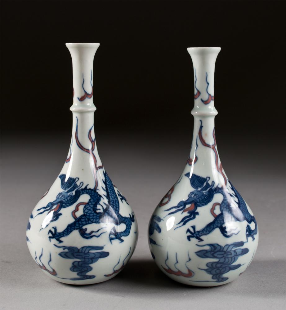 Finely painted to depict a dragon amongst ruyi clouds chasing a flaming pearl, each with blue leaf Kangxi mark. 6.5" H, probably late 19th century.