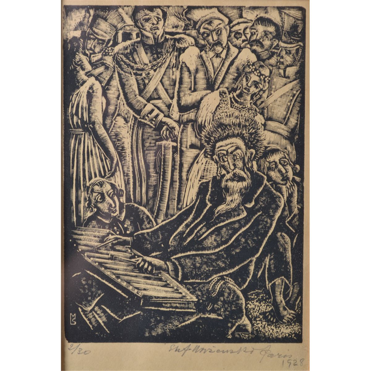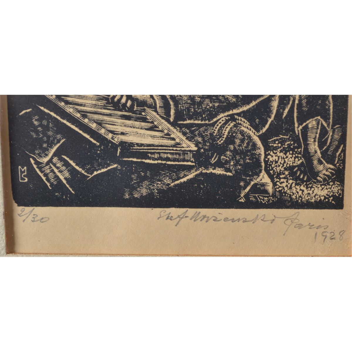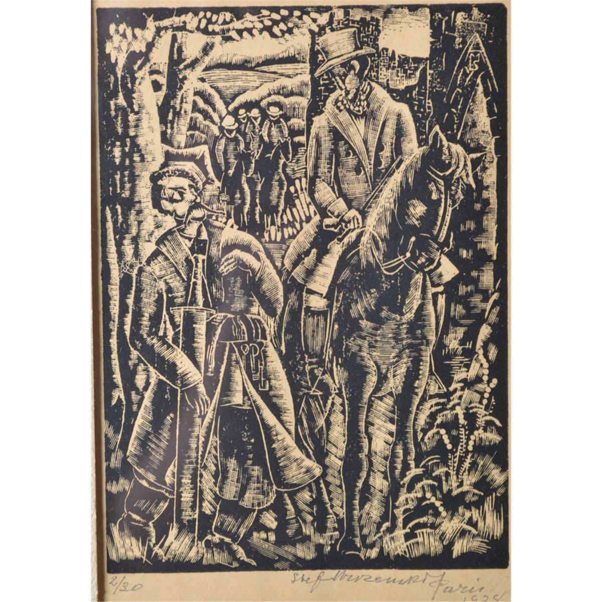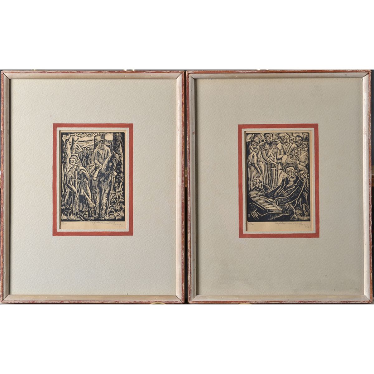 One depicts an upper crust crowd of people watching and listening to a xylophone player, very deco influenced. The other depicting horse and riders in wooded scene, very deco influenced. Both are signed and numbered 2/30 and dated 1928 in LR. 5.5" H x 4" W, sight, 14.5" H x 11.5" W, framed. Private collection of the late Benedict Markowski, a long time archivist of the Detroit Public Library.