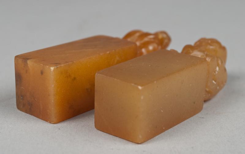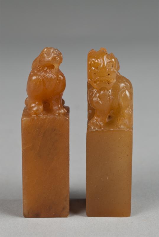Each finely carved, one to depict a foo lion, the other to depict a dragon. Each 3" H, circa 19th/early 20th century.
