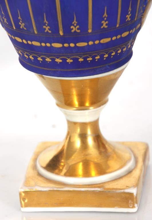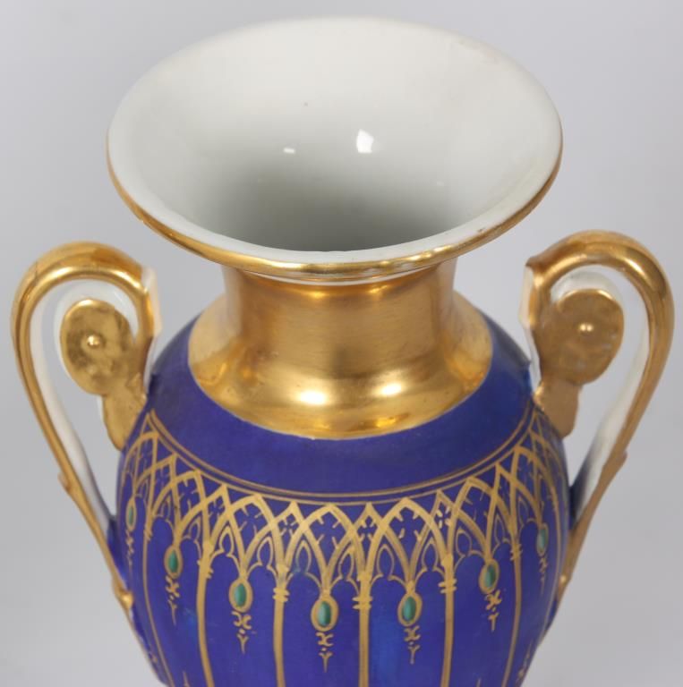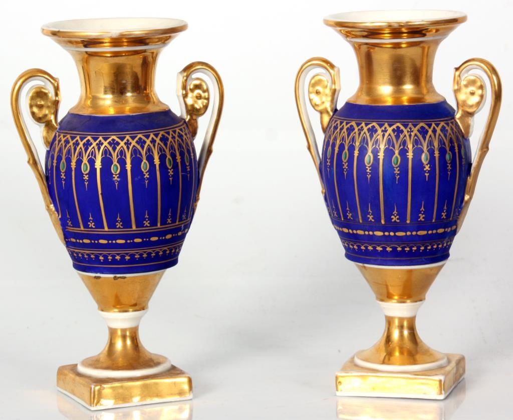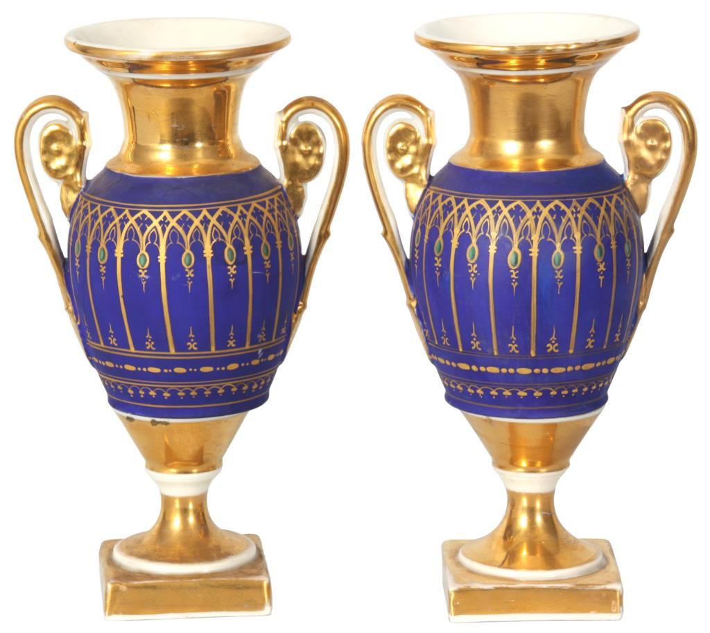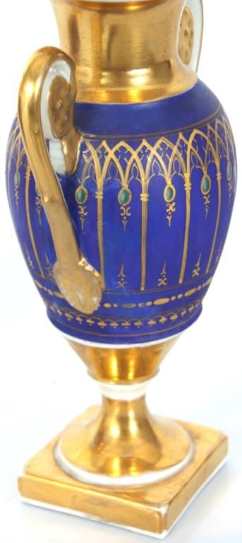 Pr. Old Paris Vases. Vases have an inverted teardrop form with a satin cobalt background with gilt and emerald design, trumpeted gilt rim, pierced side handles and square base. In good condition with no breaks, cracks, chips or repairs. 9 in. high.