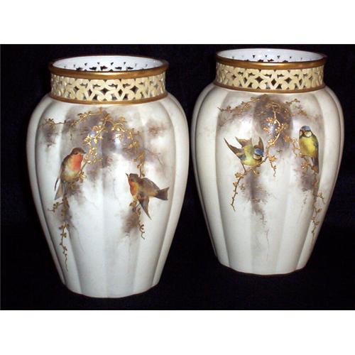 Beautiful pair of cream colored vases with gold accent at rim and raised gold branches. The birds look like they could come to life! 4" in diameter at top, 3.5" diameter bottom. Stamp is Royal China Works, Worcester, England.216 over G2911(hand written) This stamp is from George Grainger & Co.- estab; 1801. No chips or cracks