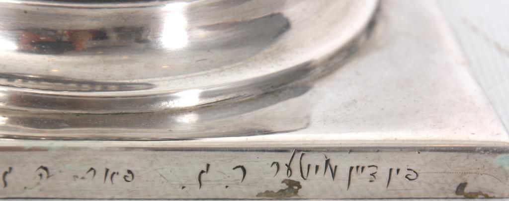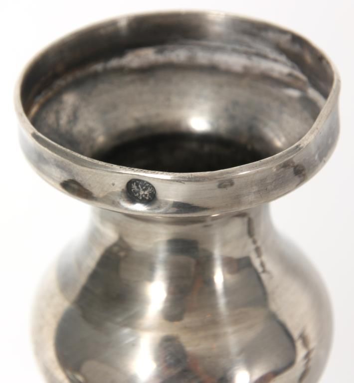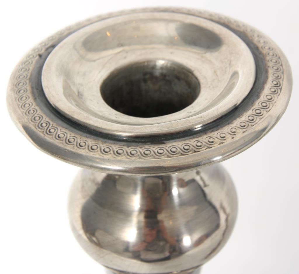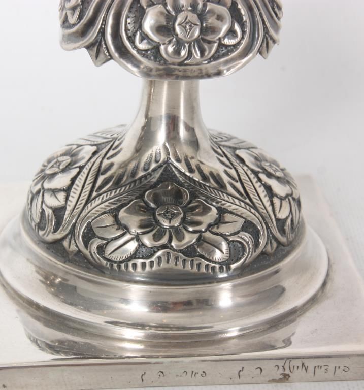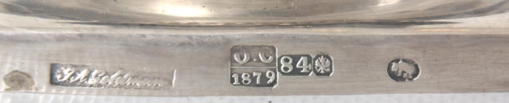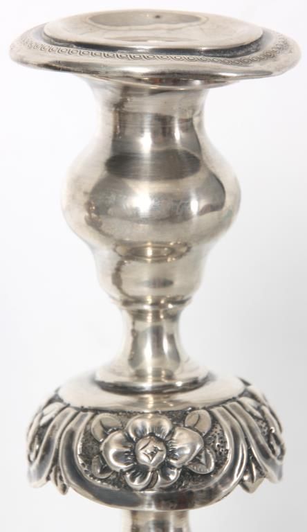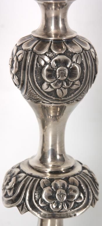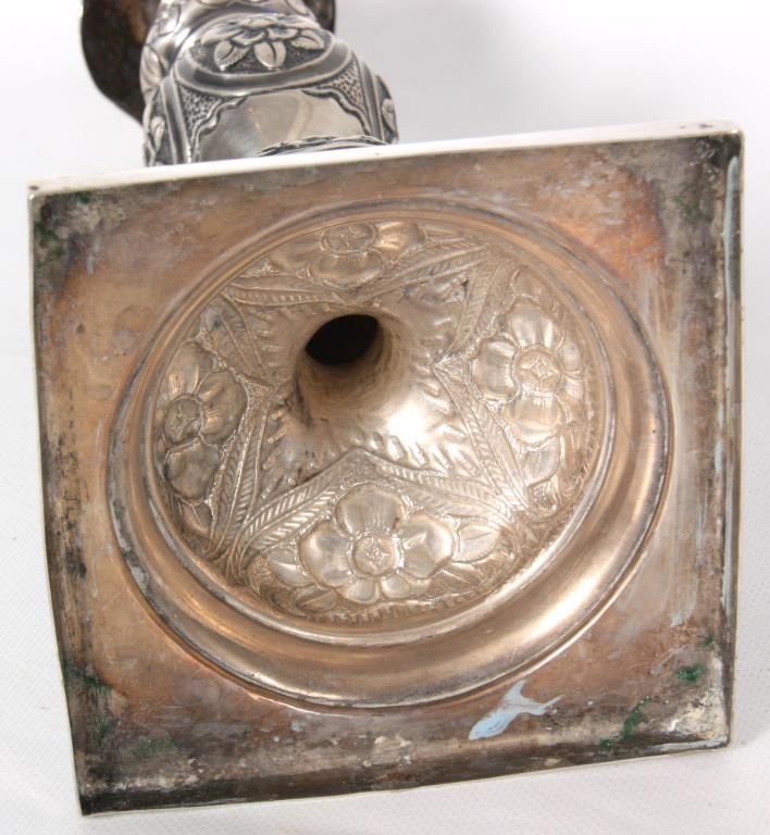 Pr. Russian Silver Candlesticks. Square platforms with serpentine edges, a domical base with repousse leaf molded border and bulbous sections through the stems with leaf and floral design. In good overall condition with minor dings, 13 in. high. Russian hallmarks including Imperial mark, 84 zol. (0.875 silver), cyrillic assayers mark dated 1879 & makers mark for J.A. Goldman. 14 in. high. 28.8 oz