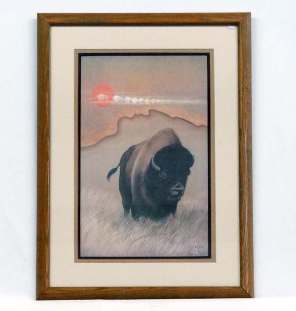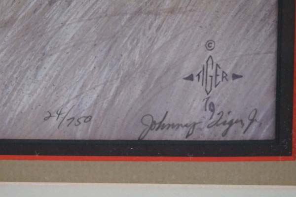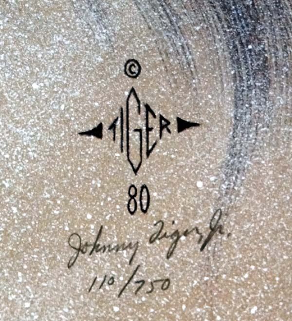 Pr Native American Signed and Numbered Prints by Johnny Tiger, Jr., #1 is a 1980 signed and numbered 110/750, framed and under glass, triple matted #2 is a 1979 signed and numbered 24/750, framed and under glass, triple matted, Artist Bio: Johnny Tiger, Jr. (born 1940) is a Muscogee Creek-Seminole artist from Oklahoma.