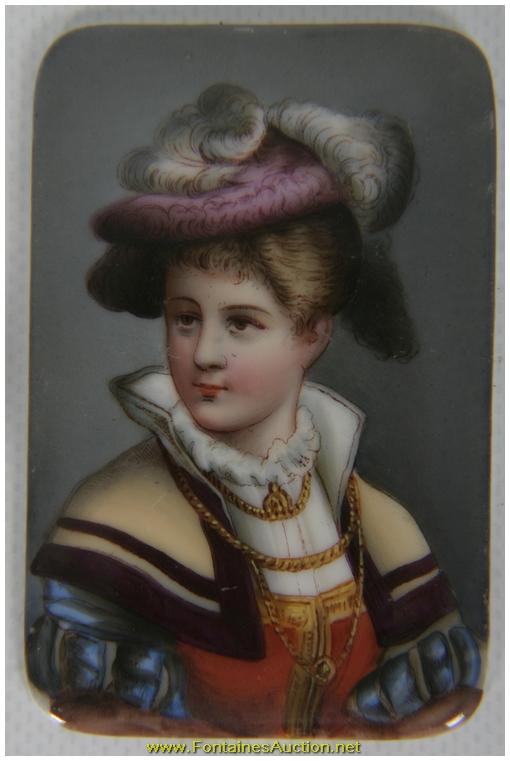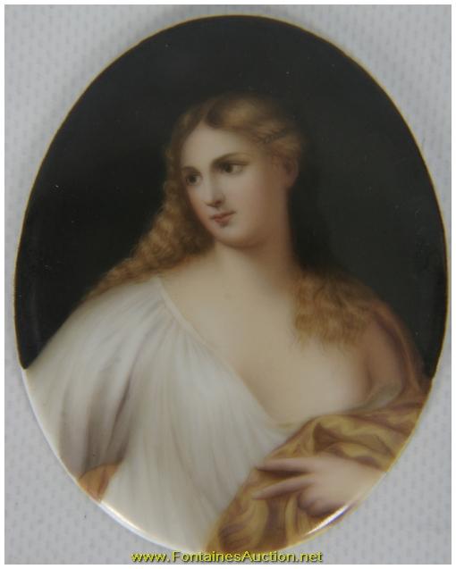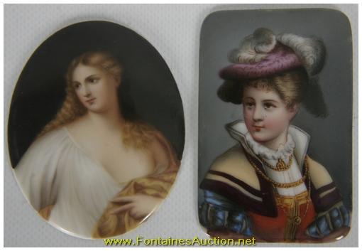 Pr. Small Porcelain Portrait Plaques. Both are unidentified makers; the oval is a portrait of "Flora", after Titian; the rectangular portrait is of a duchess. Both are in excellent condition, no chip or scratches. 2.5"W x 3.5"H. Estimated Value$200 - 300.