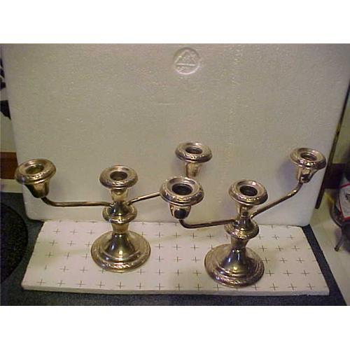 sterling candleabras (pr); 3 candles each signed on weighted base Amstom Sterling; re-enforced No. 531 on a 3.25" diameter base; 6" tall; (c) 1900's, beautiful ; some polishing needed