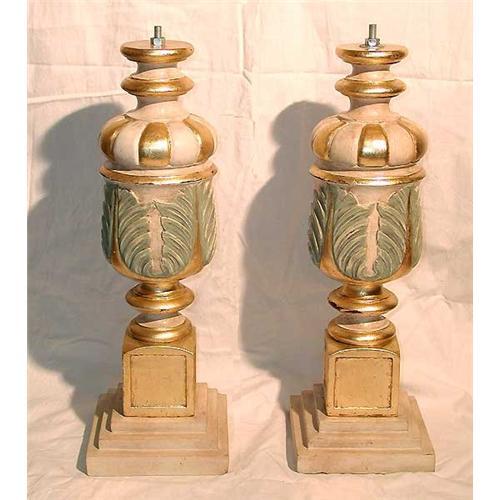 </font></strong>Pair of architectural elements made into lamps, gold leaf and painted finish, hand waxed, hand cut stone bases. They are pre-drilled and ready to wire. Dimensions: 21 inches high x 7 inches square at the base.
