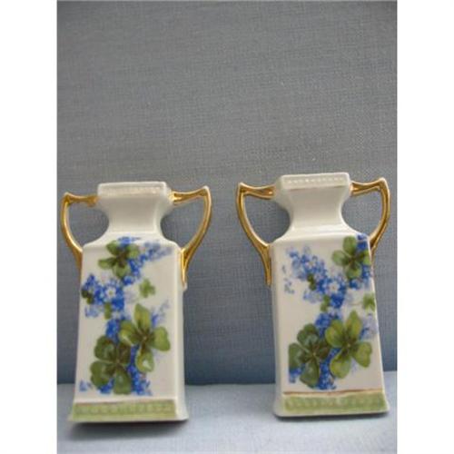 set of 2 German Antique 1920 Porcelain vases are stunning with gold trim blue and green colored floral pattern marked with sticker from the owner indicates that these are from post war and from Germany given to the owner in 1920 taped "May gave this to me in 1920". unable to verify the other writings except Germany. these are very well kept and free of chip,crack or crackel. prized for collectors..