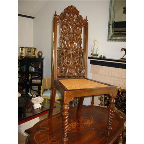 magnificent set of 2 mahagony victorian antique high back chairs with wicker seating and wonderful carving. it is very decorative. in very good condition with some imperfections crack and nicks. 46.25 " H. - 14.25 " W. and the seating 16.25 " W. or deep. legs 1790 style.
